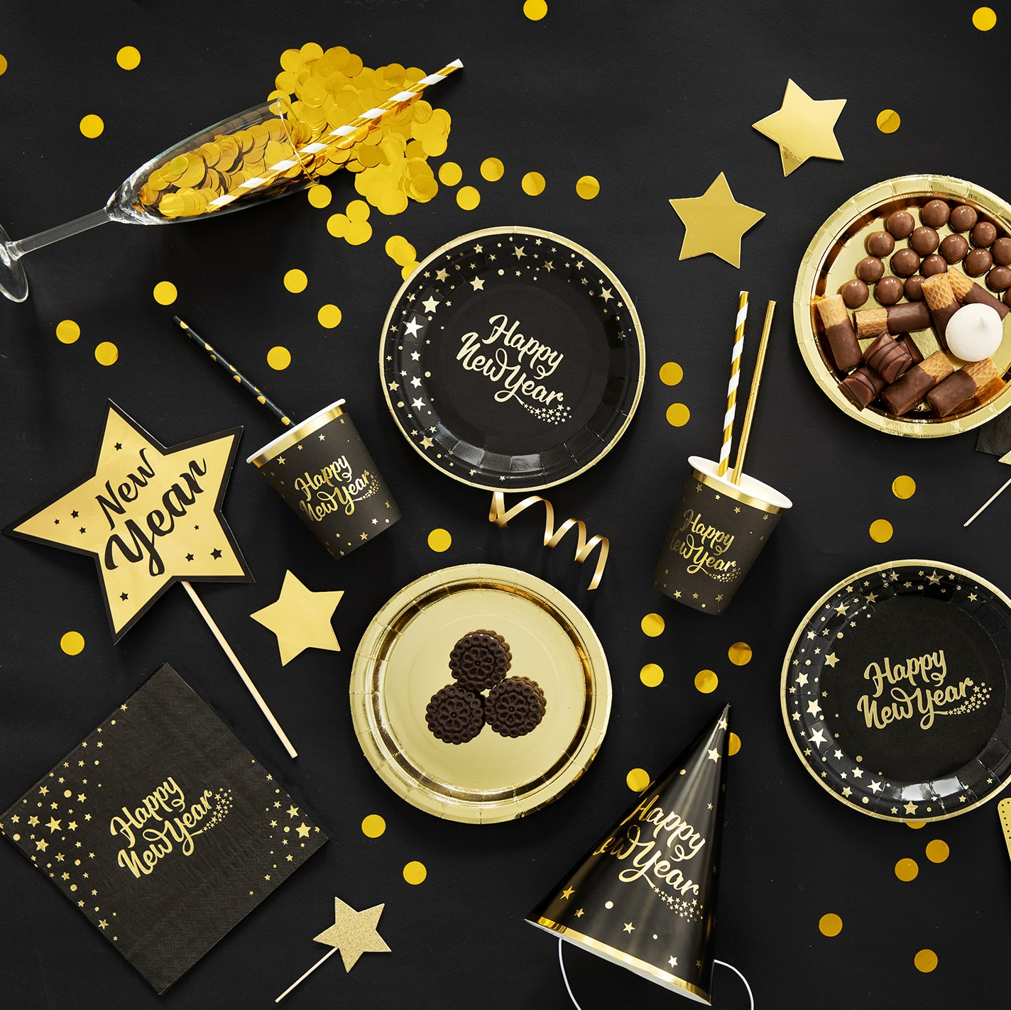 Czarne serwetki ze złotymi gwiazdkami i napisem Happy New Year. Elegancki i praktyczny dodatek, który dopełni noworoczną kompozycję na imprezowym stole czy bufecie.