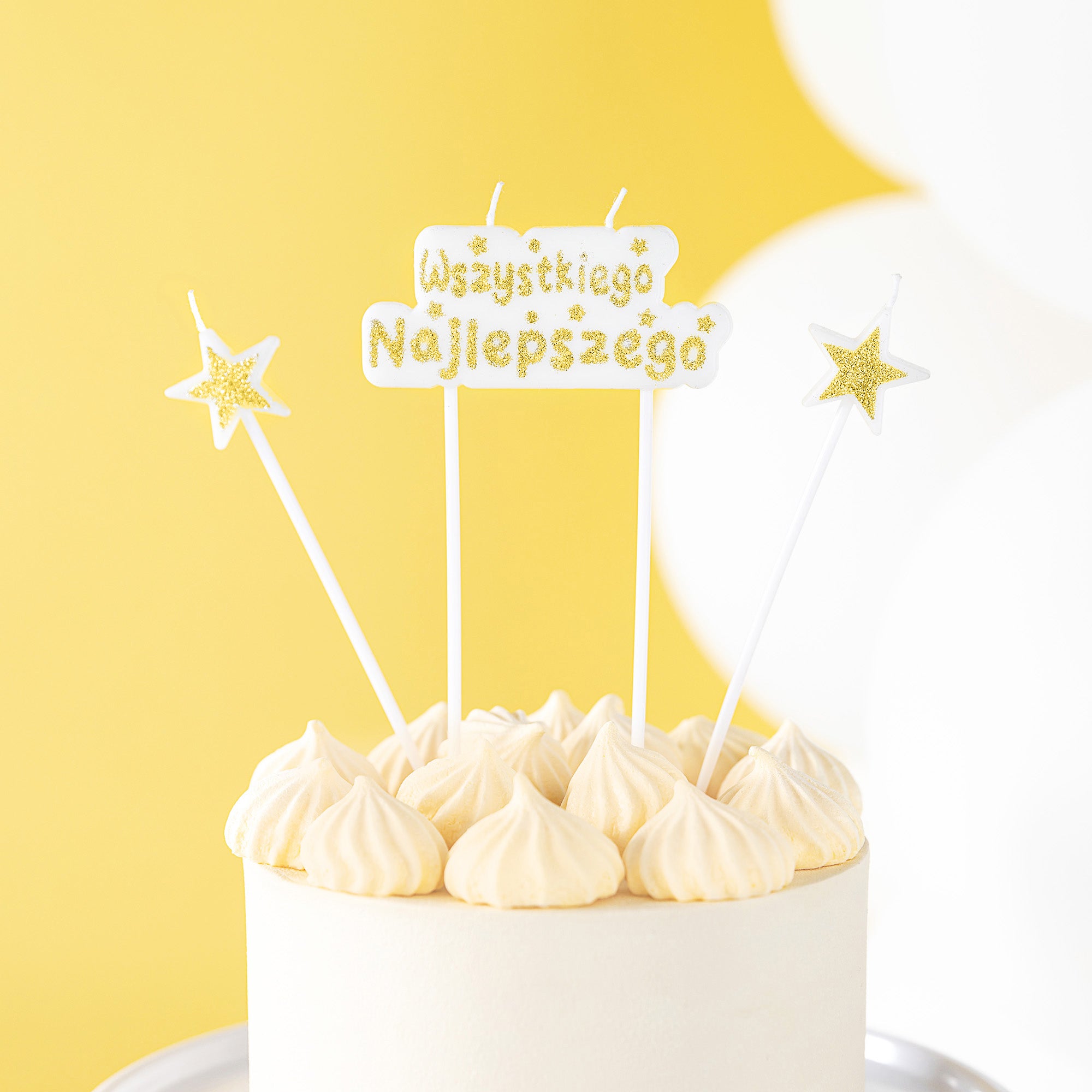 • Wysokość: Świeczka z napisem Wszystkiego Najlepszego: ok. 15 cm, Świeczki gwiazdki: ok. 14 cm
