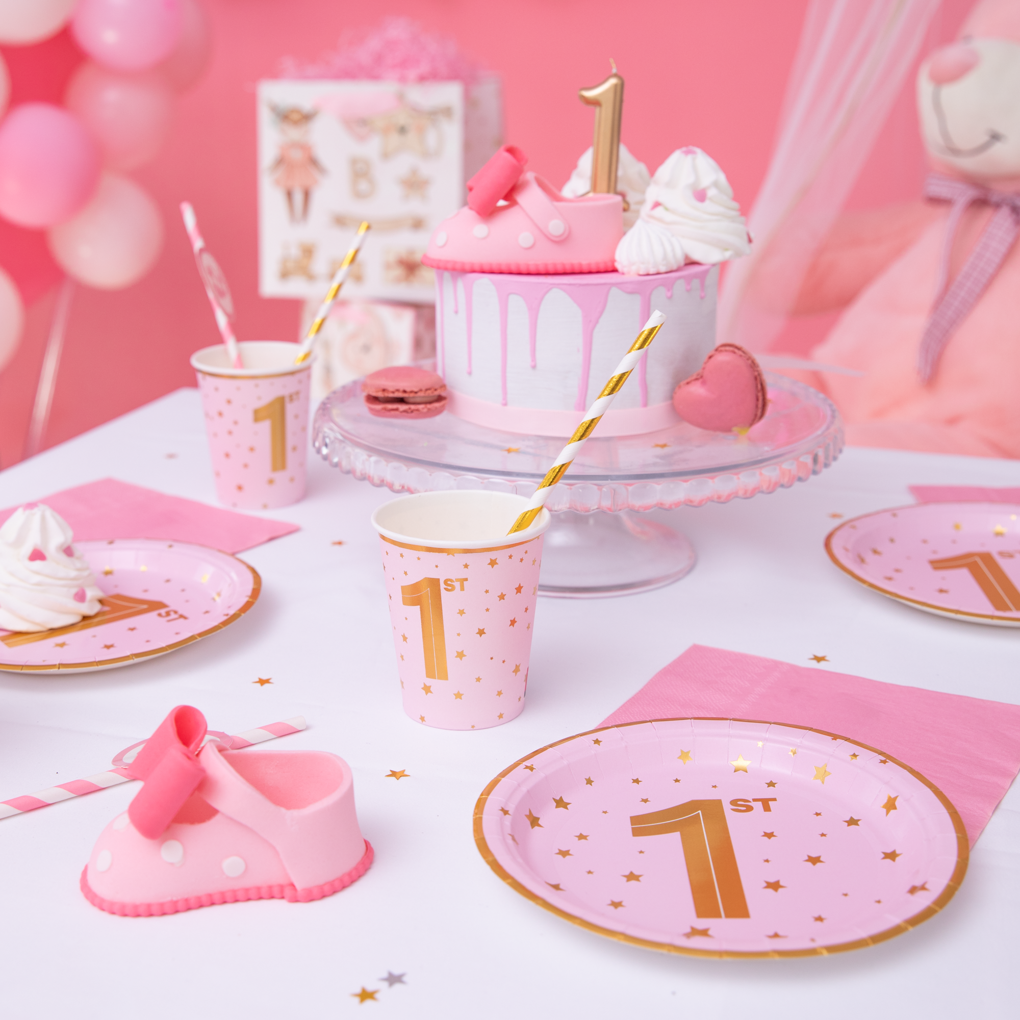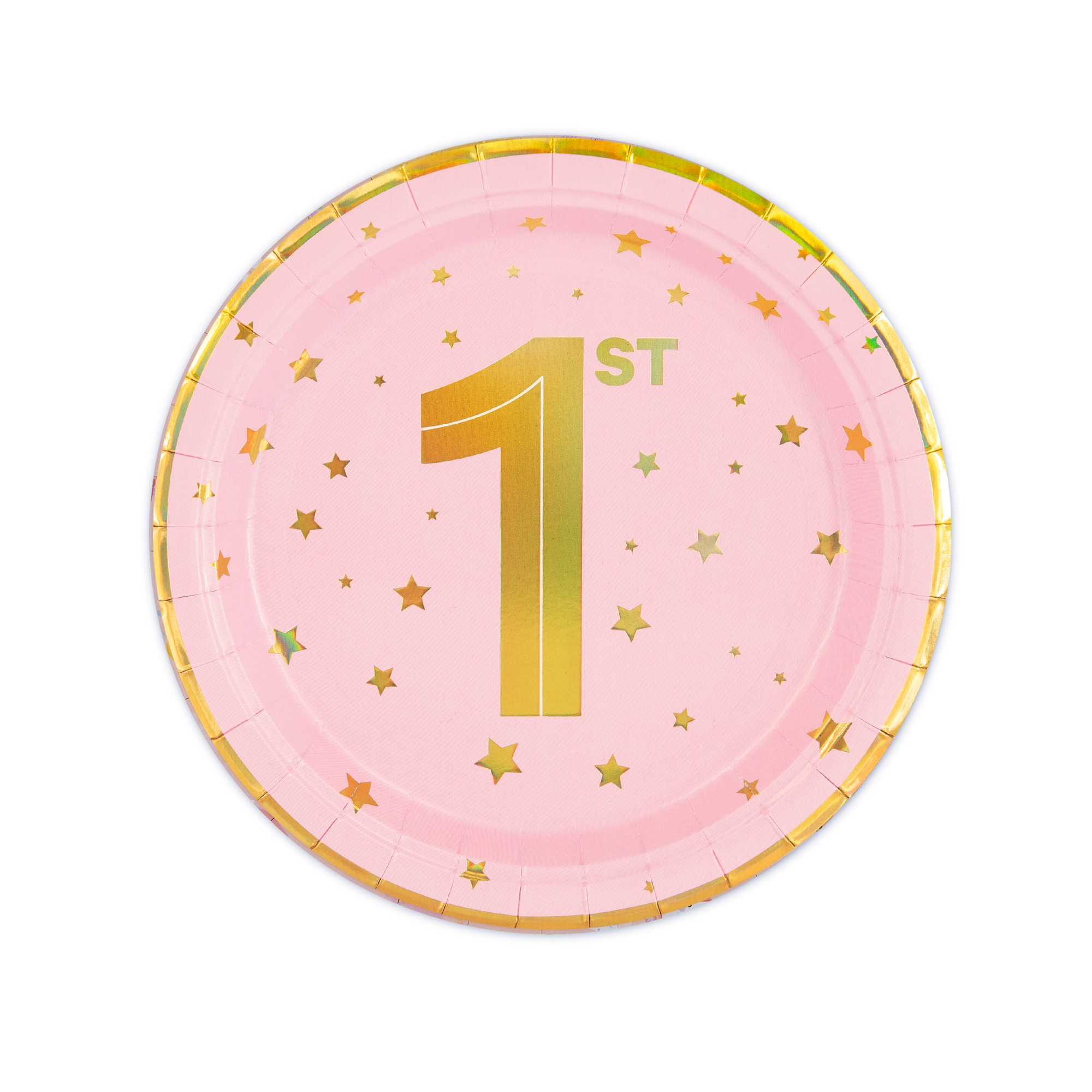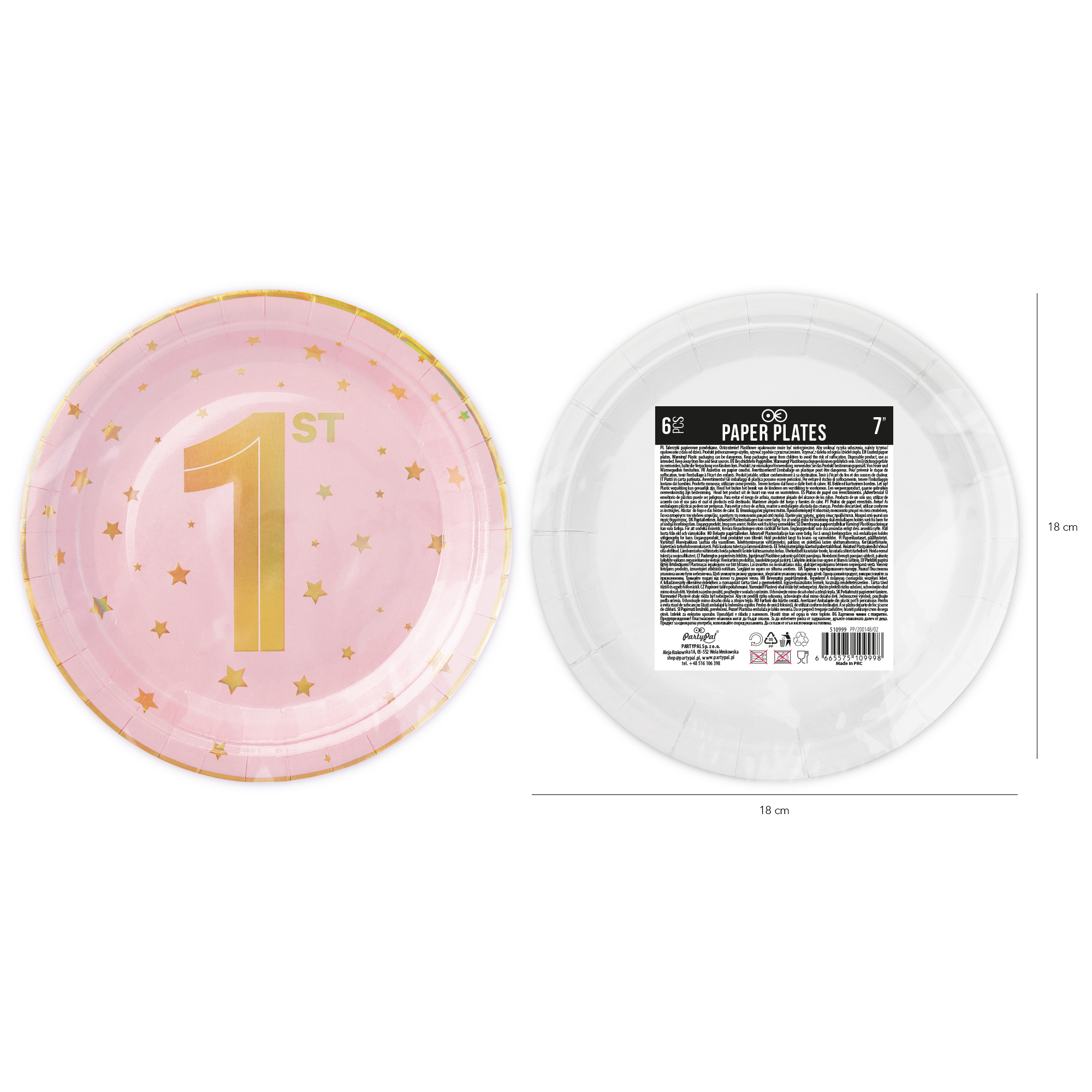 Talerzyk papierowy różowy w złote gwiazdki Roczek 7cali 6szt.
