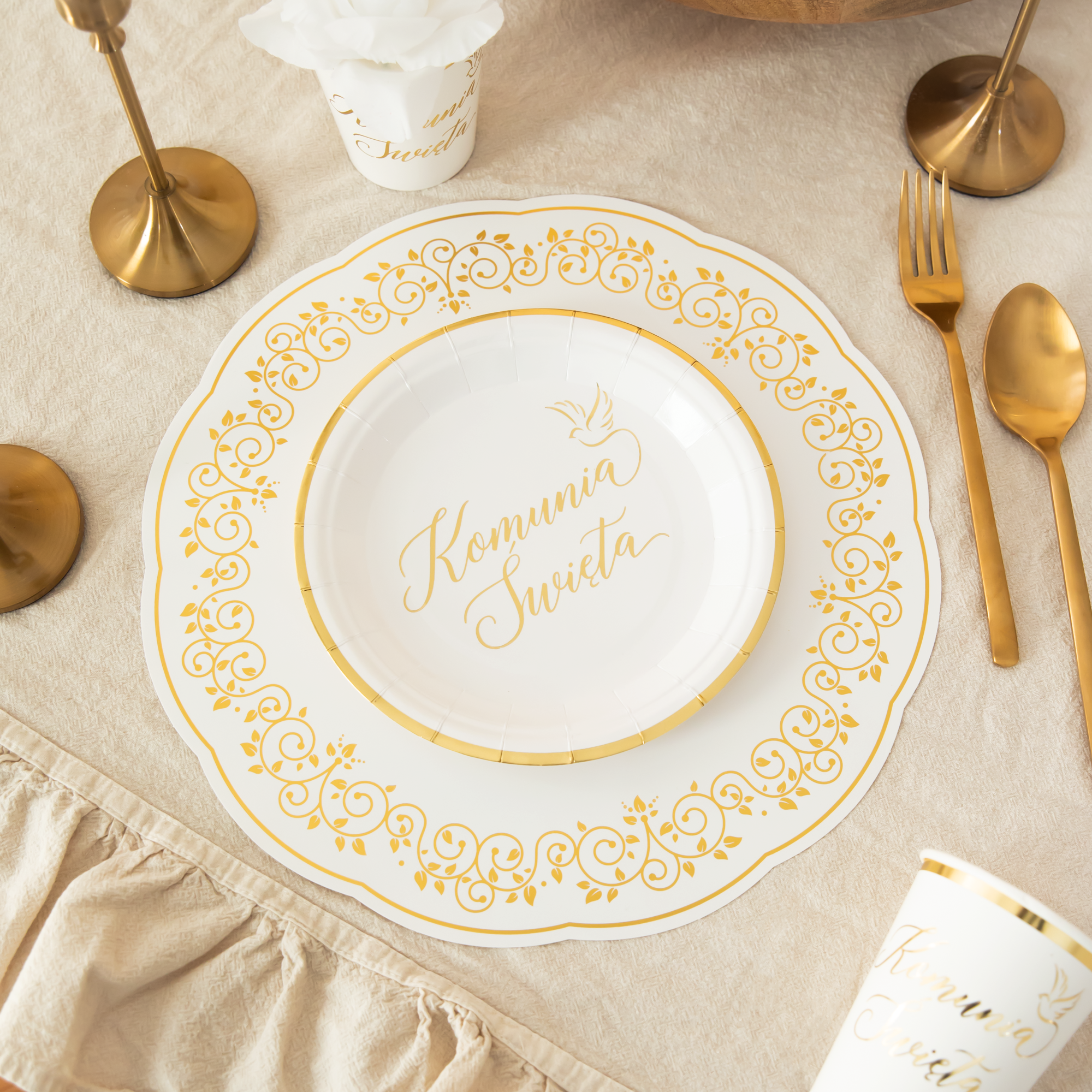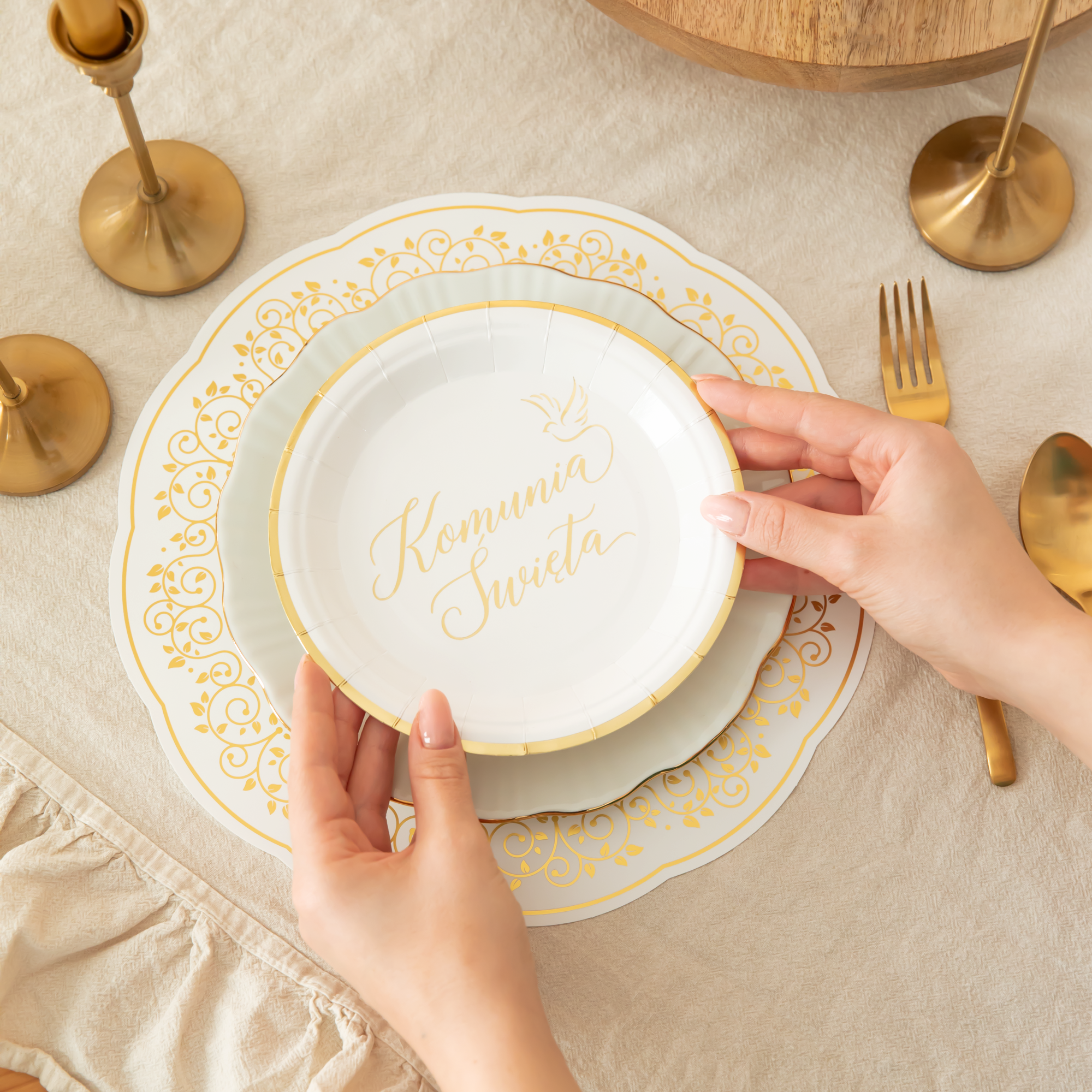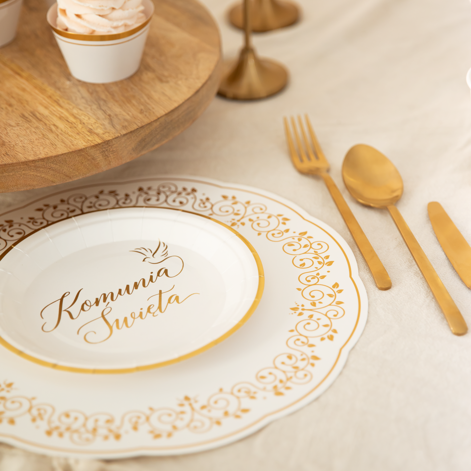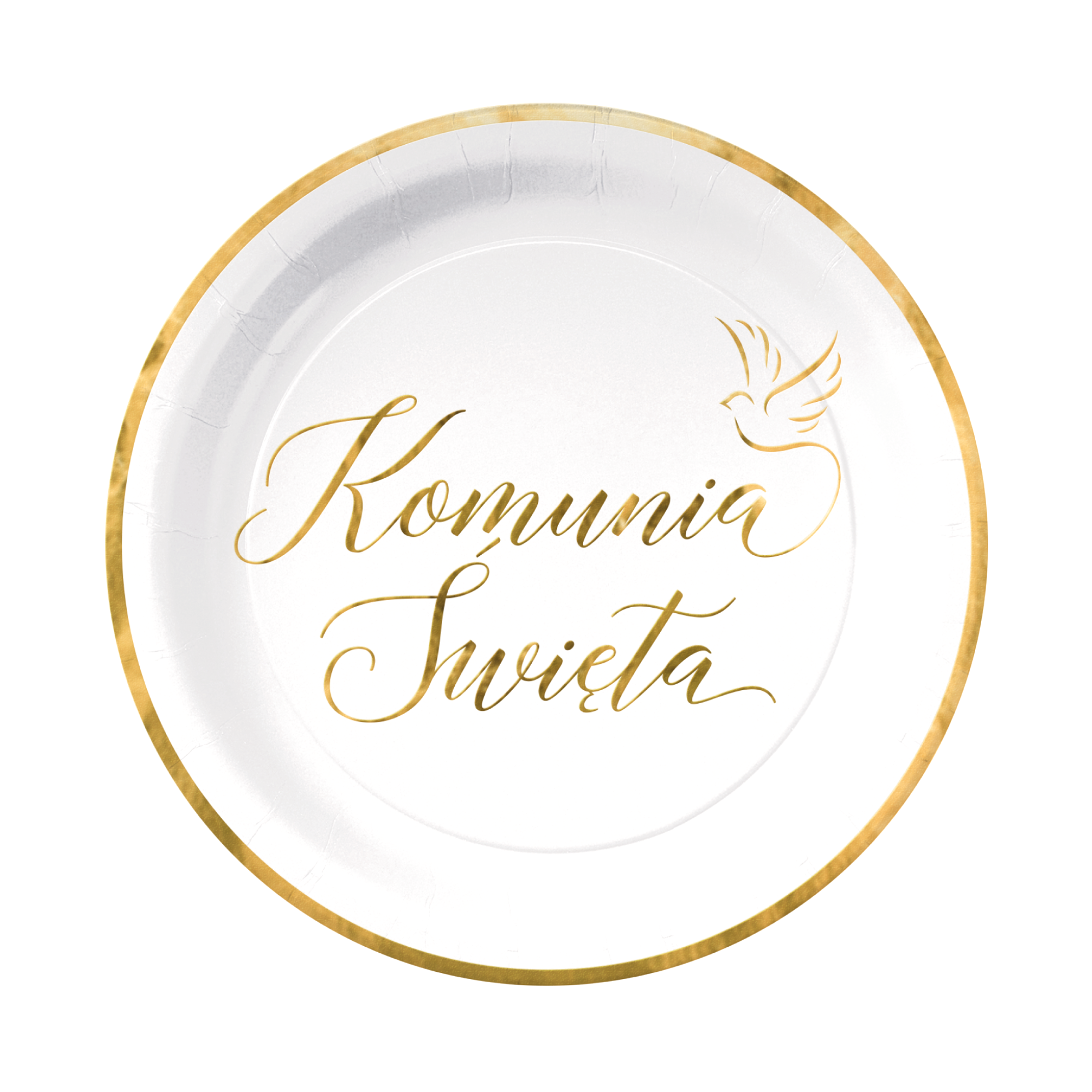 Eleganckie talerzyki w kolorze białym, z motywem gołębia oraz złotym napisem Komunia Święta.