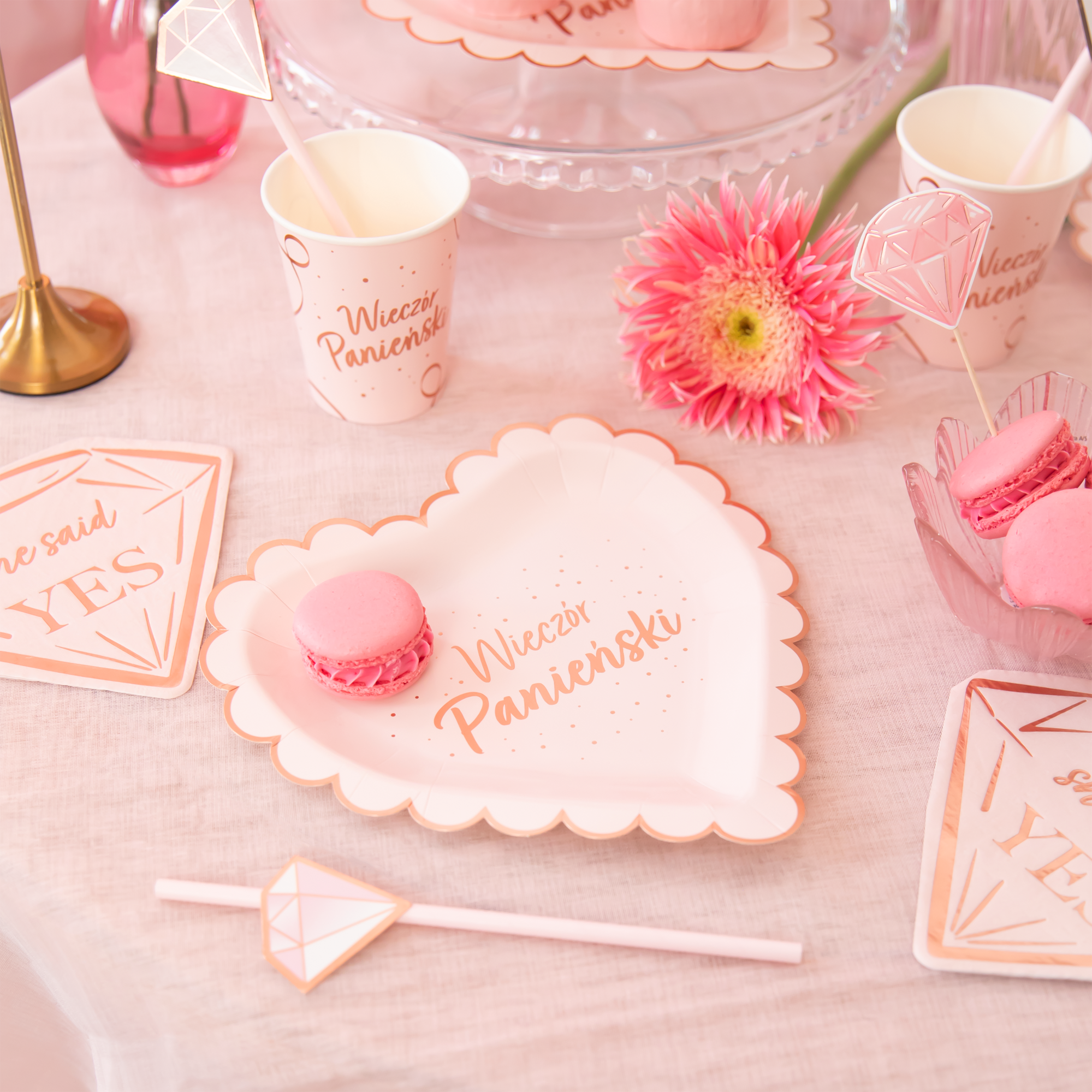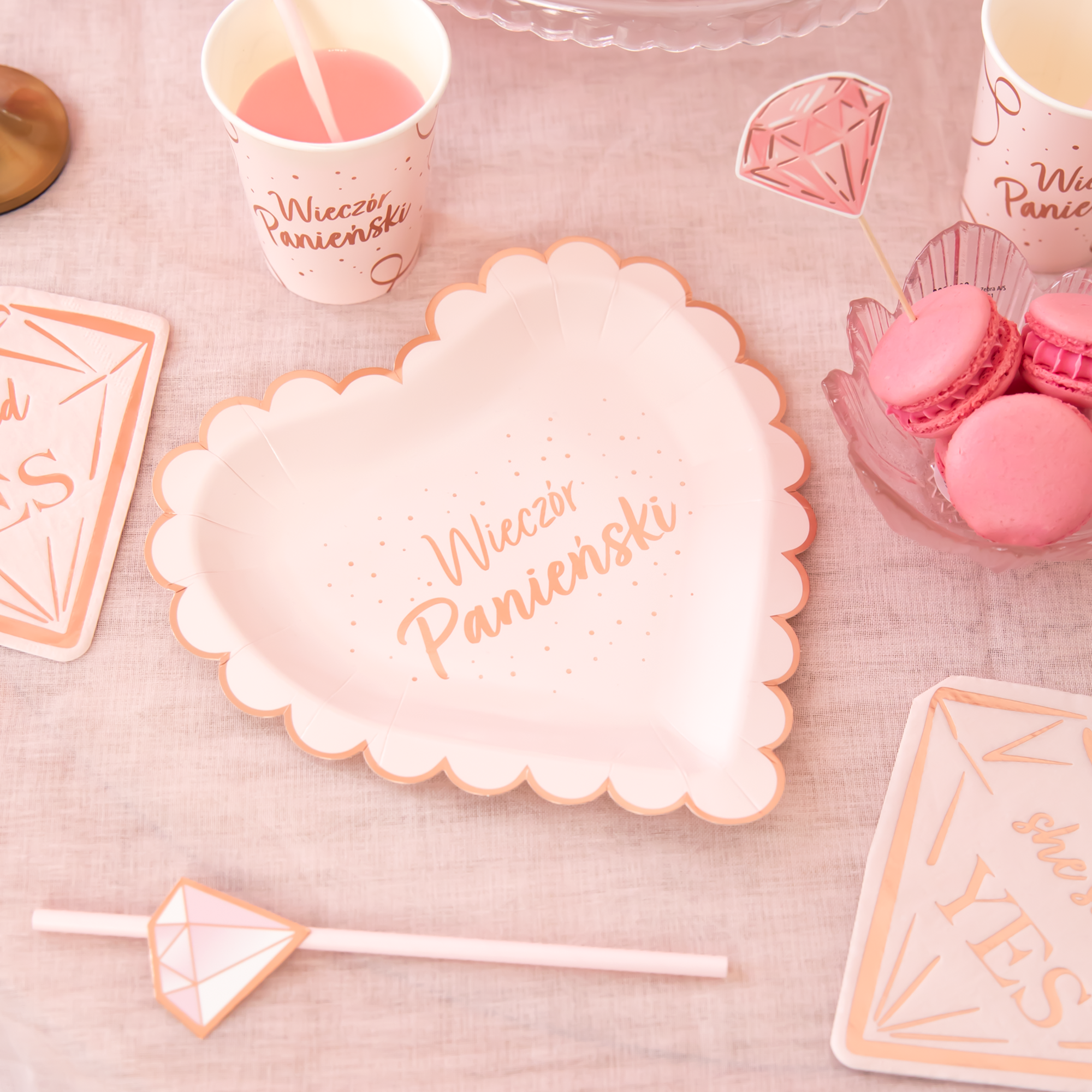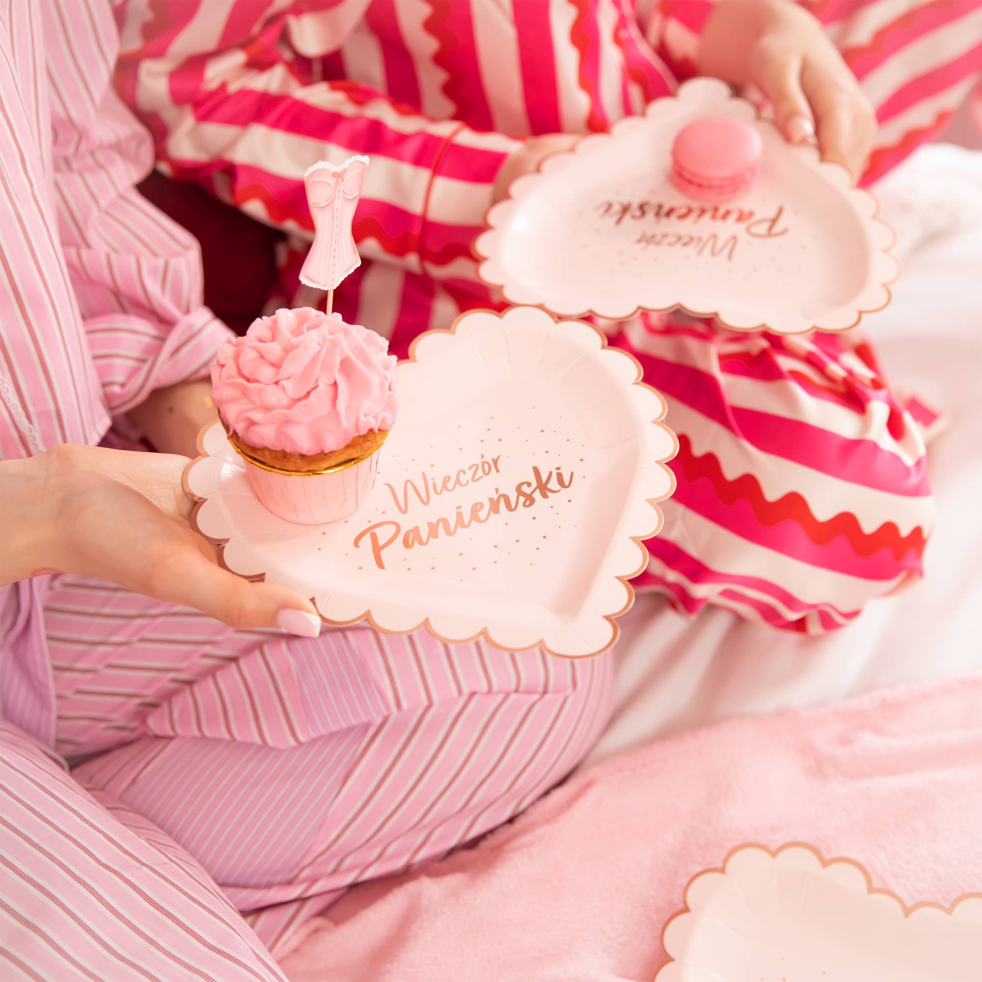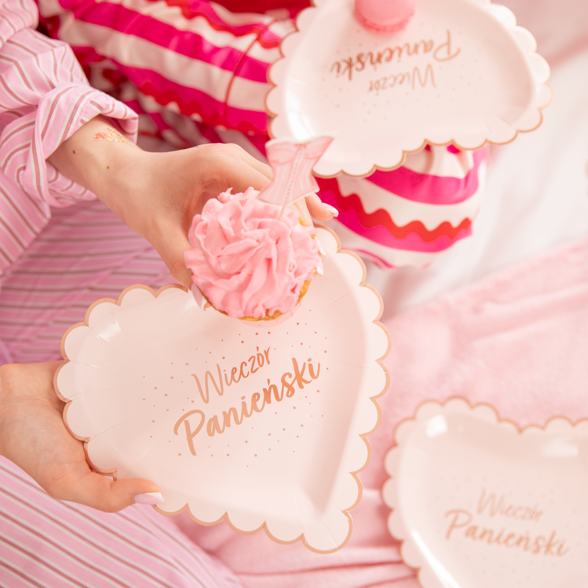 Talerzyki w kszt.ałcie serca z ozdobnymi kropeczkami i napisem Wieczór Panieński.
