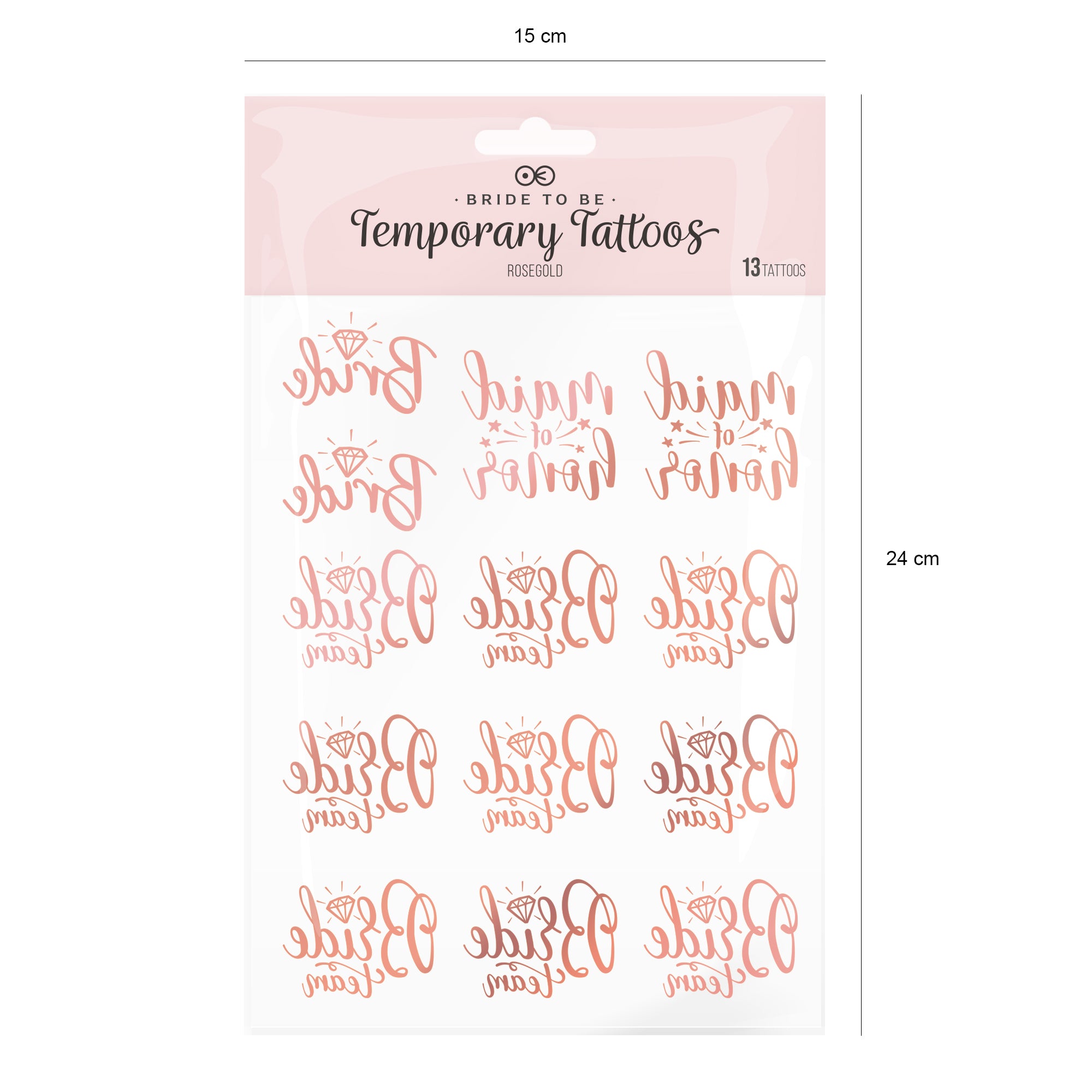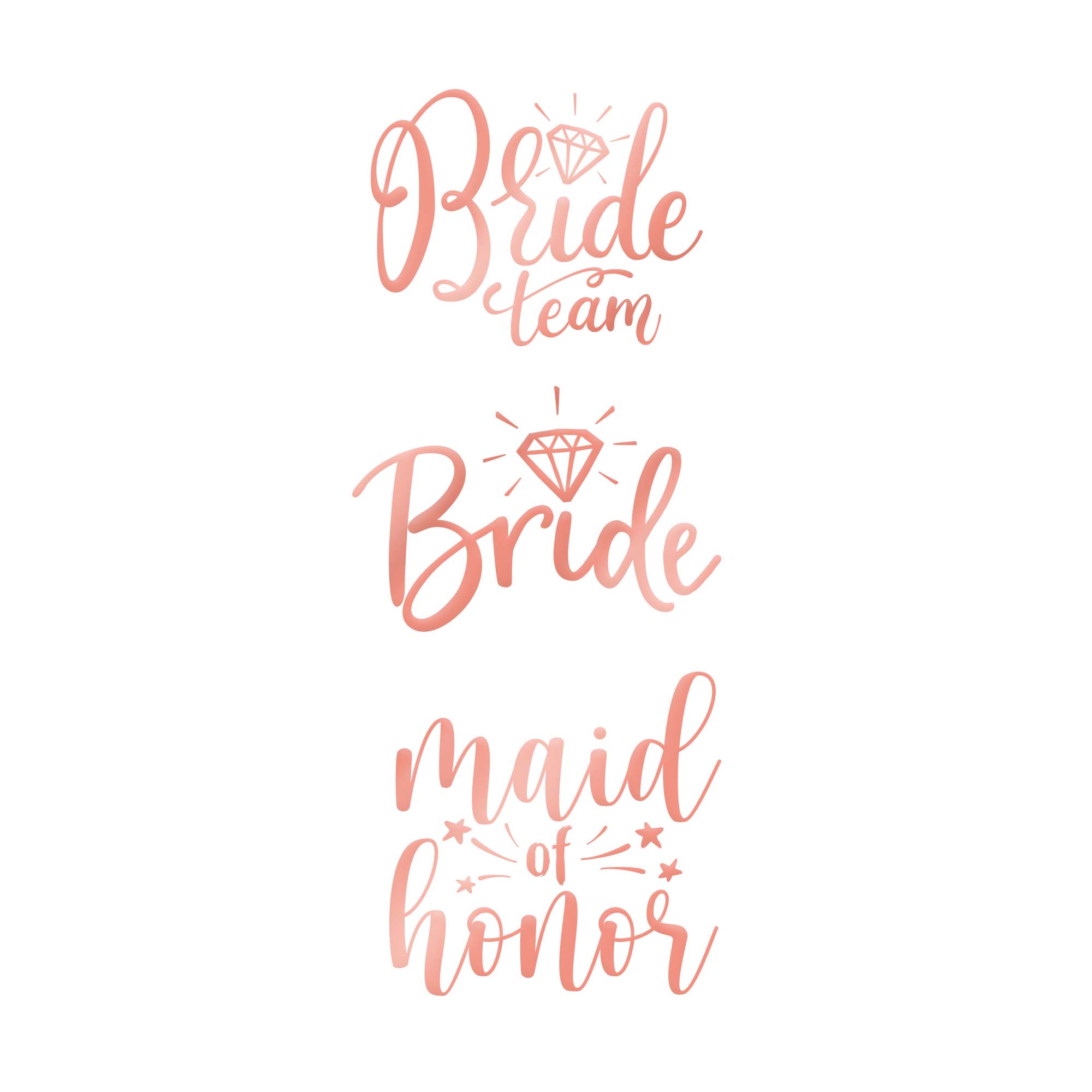 • Tatuaże zmywalne w kolorze rosegold: Bride (2 szt.), maid of honor (2 szt.), Bride team (9 szt.)