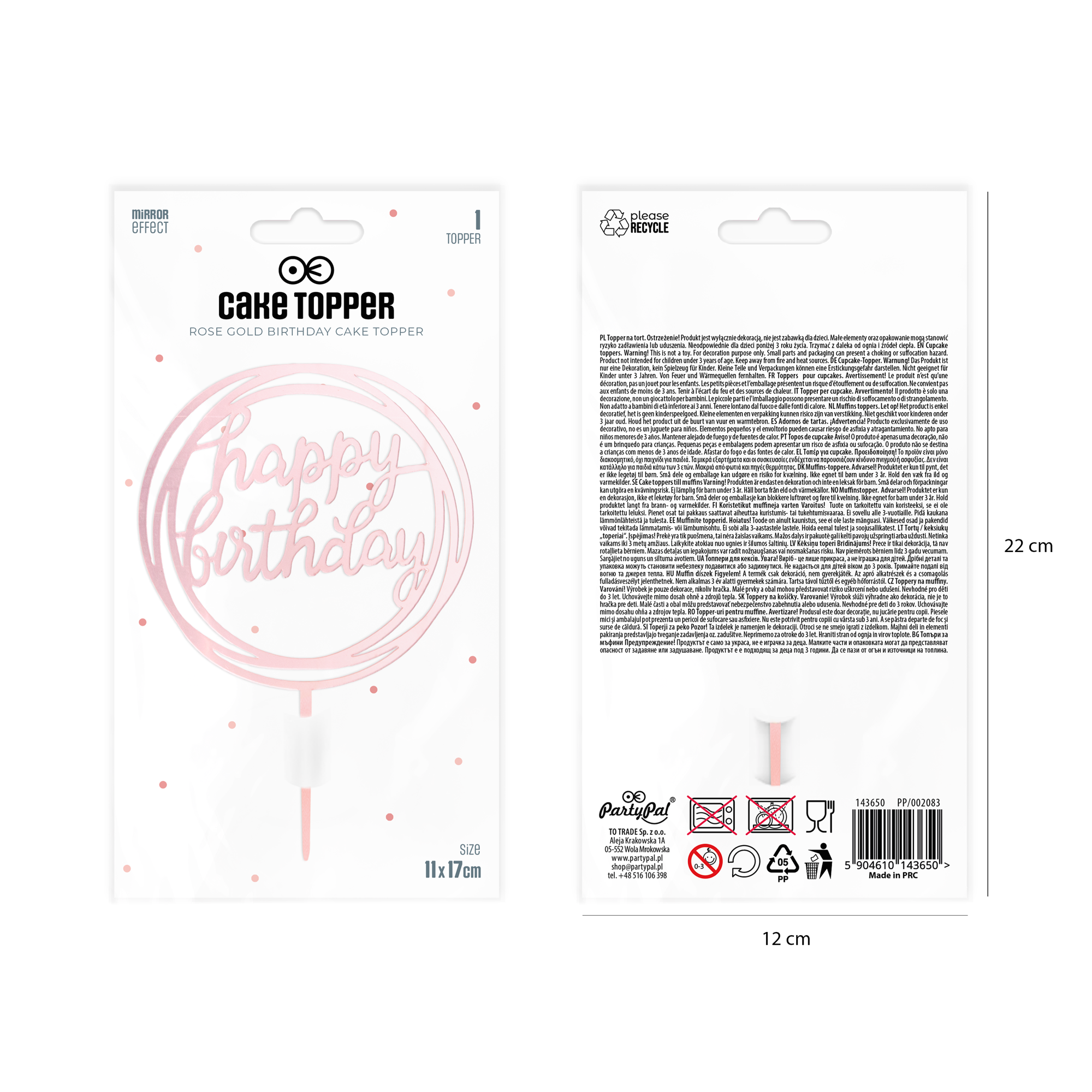 Topper na tort Happy Birthday okrągły lustrzany rose gold 1szt.