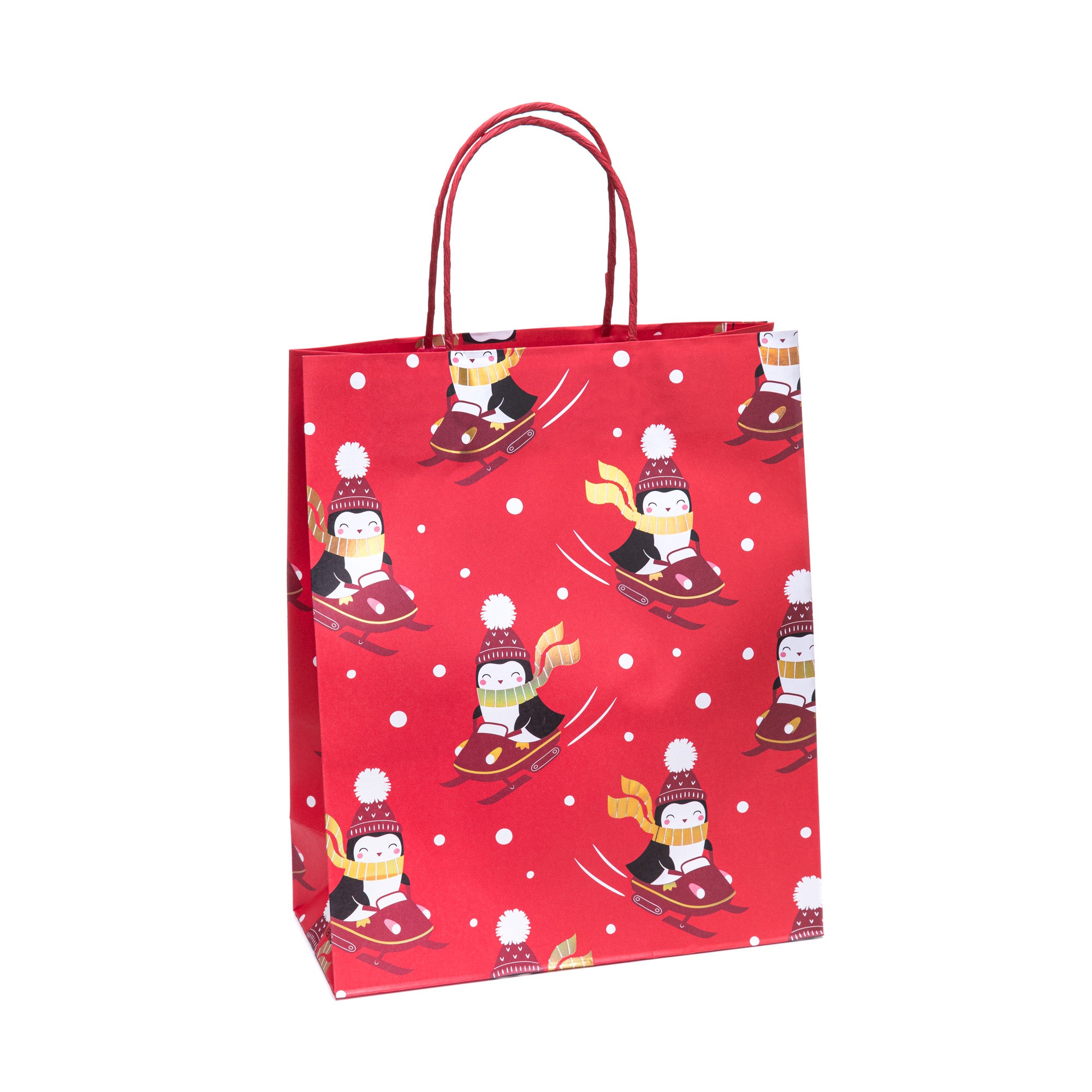 Torebki na prezenty świąteczne, która przede wszystkim spodobają się dzieciom. Na czerwonym tle znajdują się wesołe postacie Św. Mikołaja, skrzatów, pingwinka oraz ośnieżonej bombki. Torebki prezentowe wyposażone są w mocne czerwone uchwyty.
