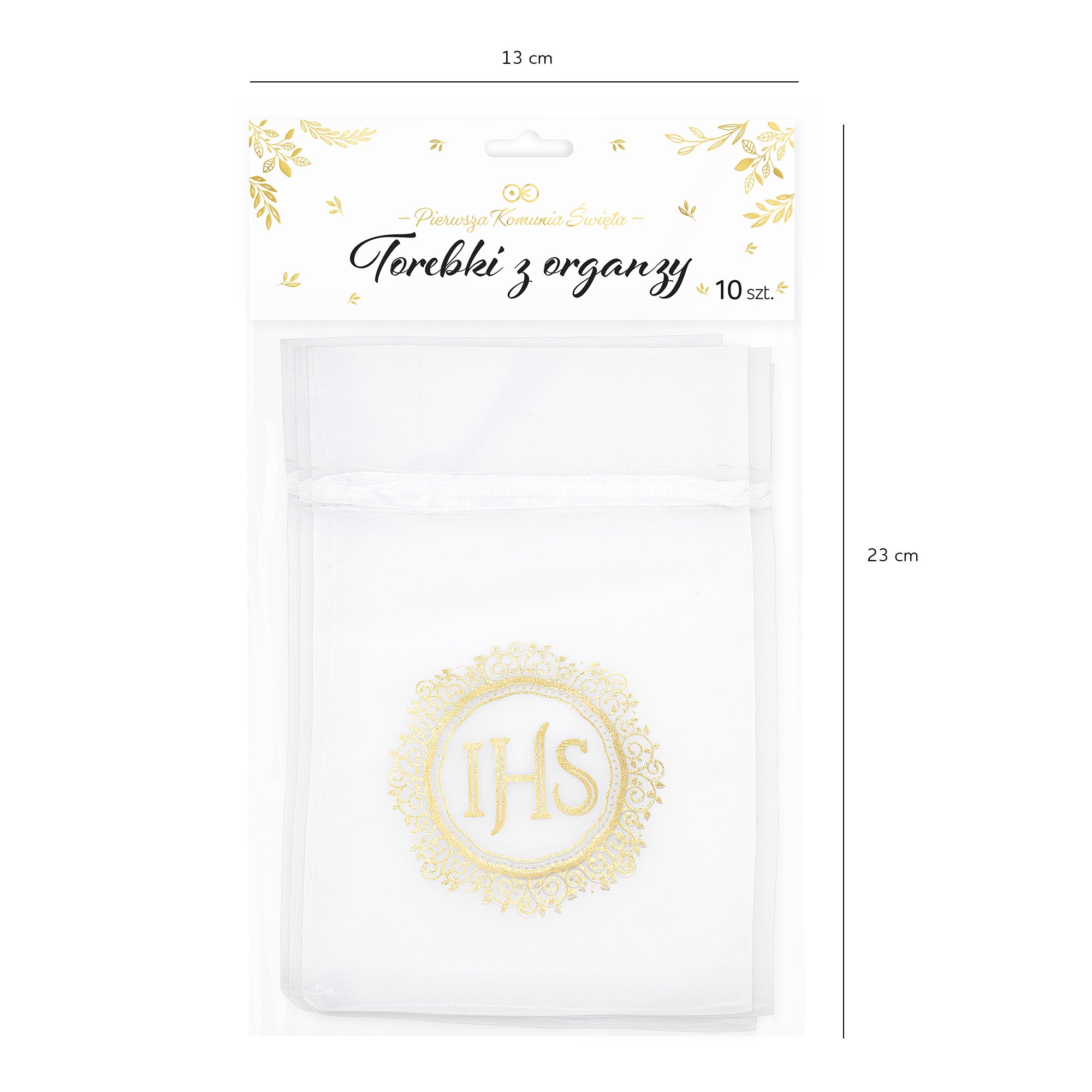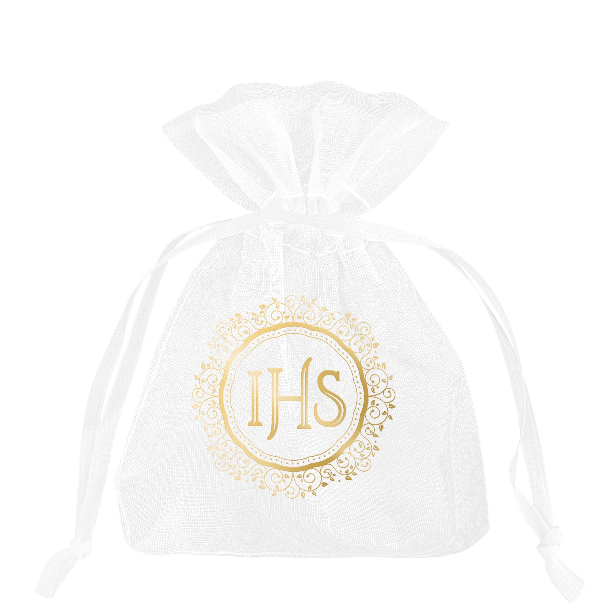 Woreczki z organzy w kolorze białym ze złotym, finezyjnym motywem hostii IHS. Wyjątkowe opakowanie dla drobnego prezentu na komunię, zwłaszcza biżuterii.