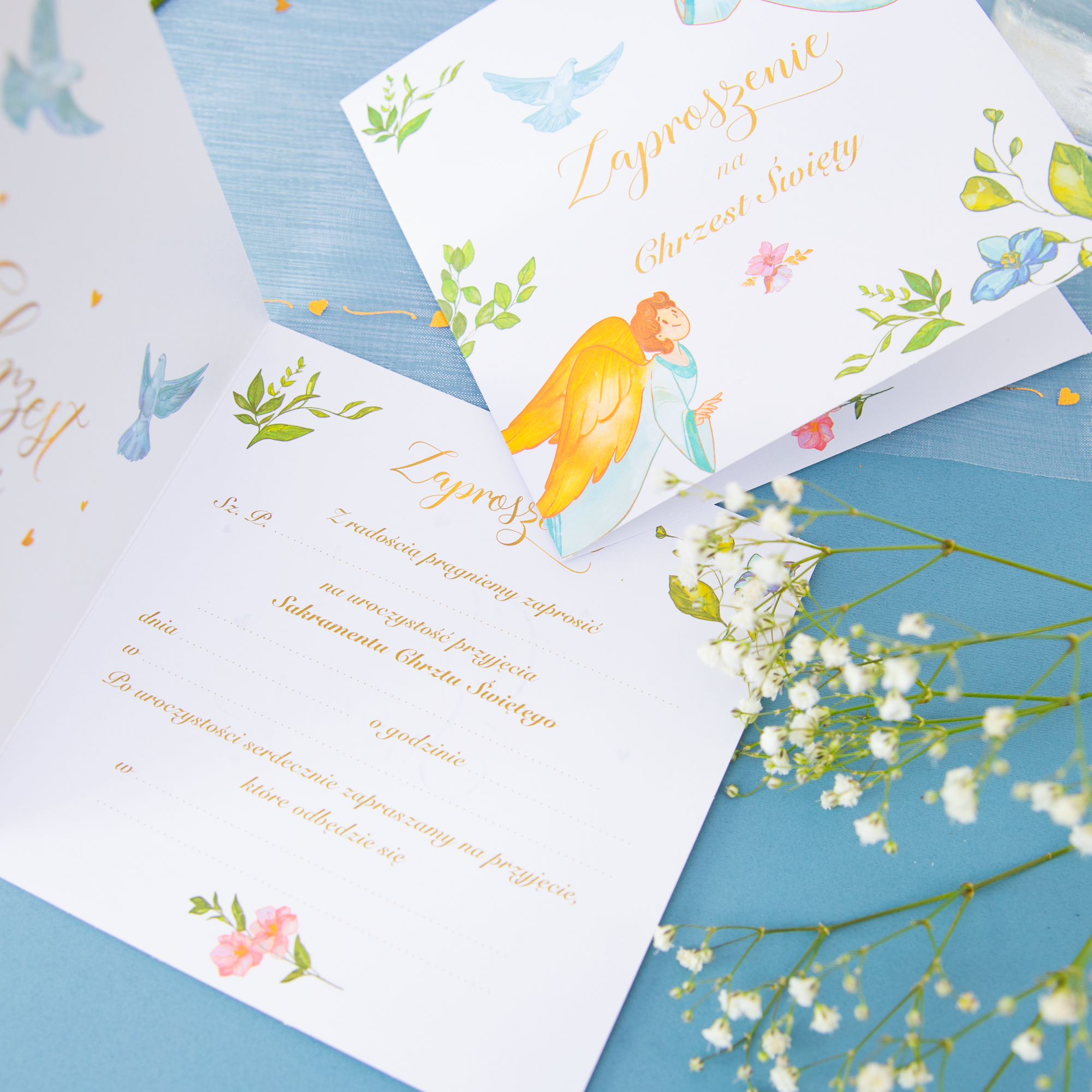 Zaproszenie na chrzest z kolekcji Anioły z widocznym tekstem w środku.