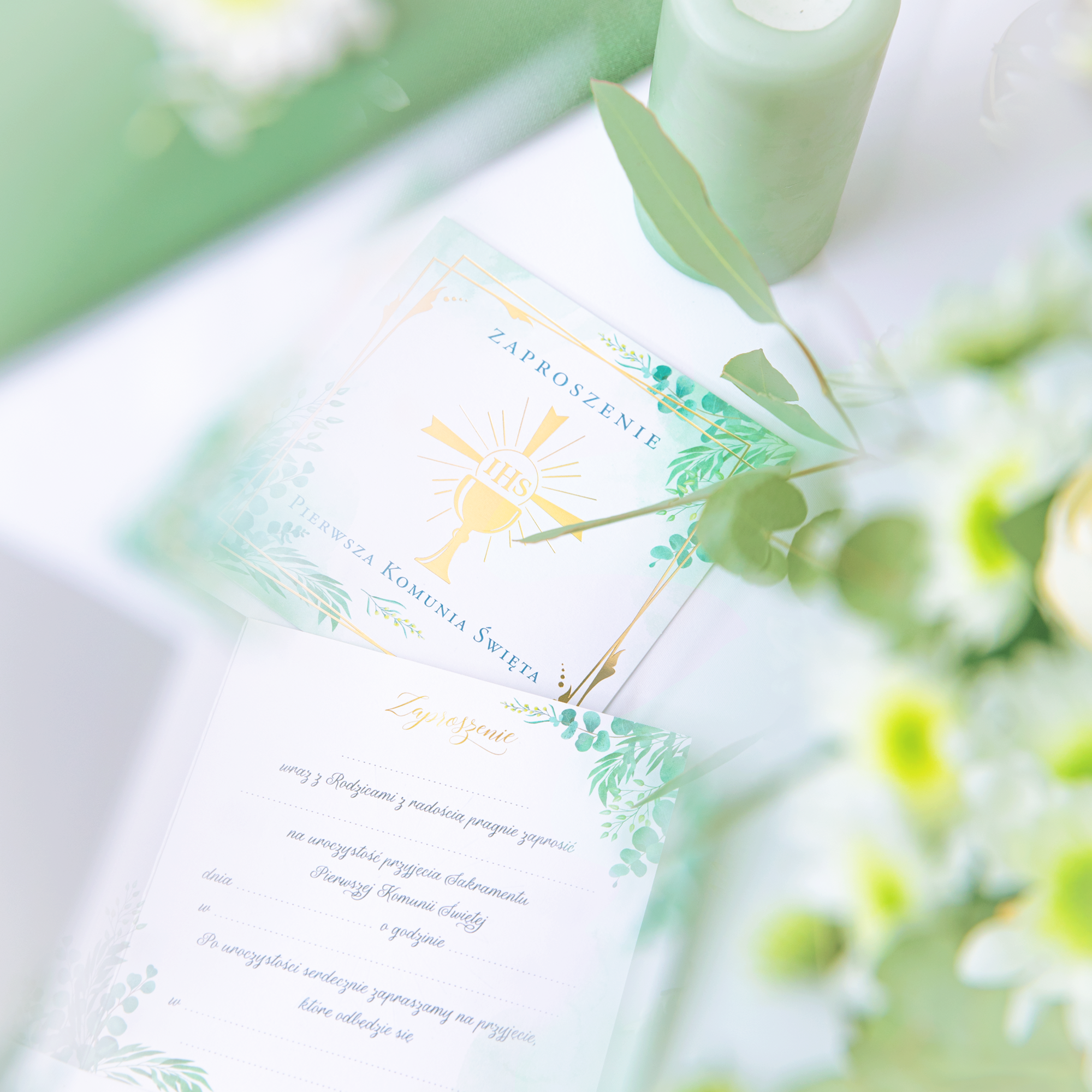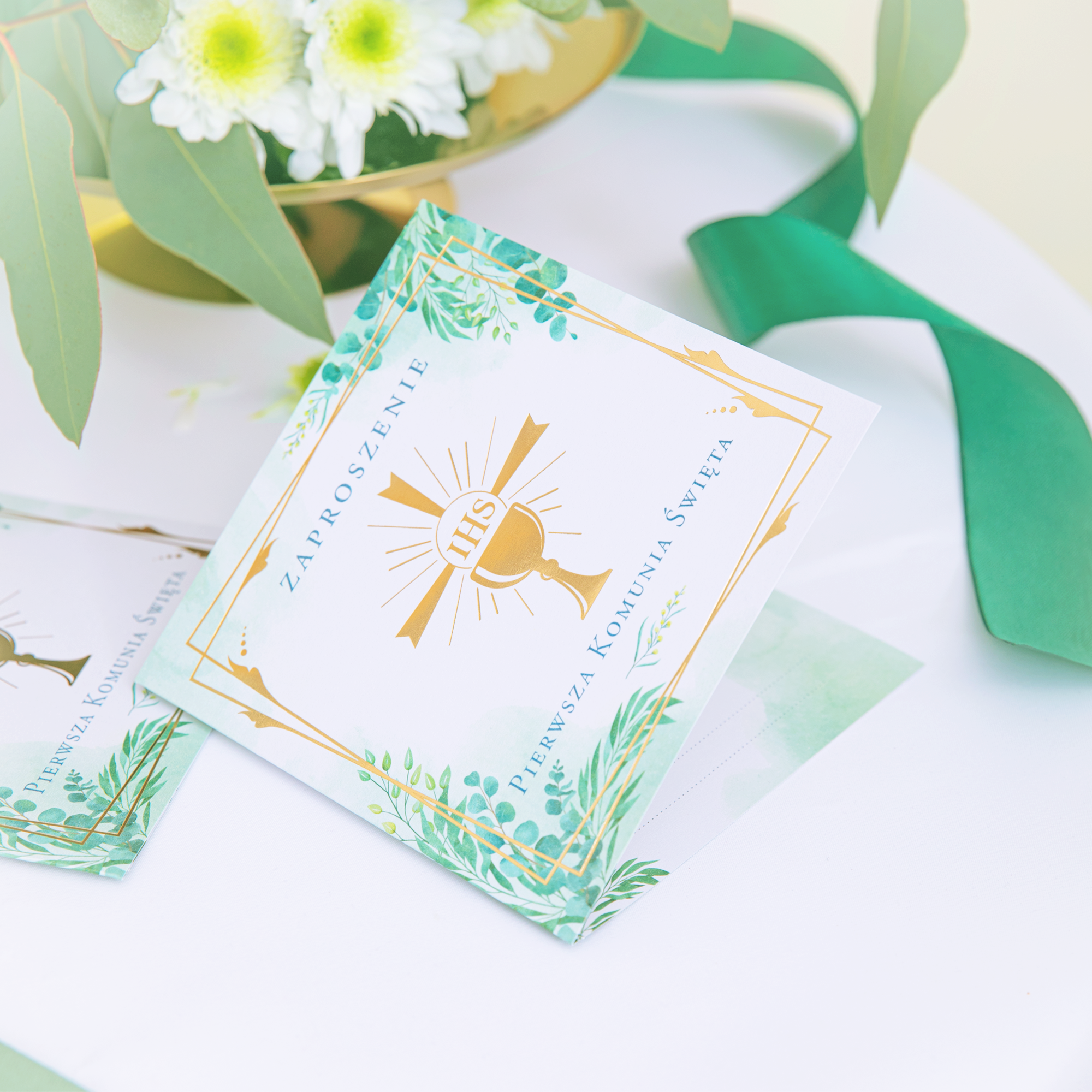 Eleganckie zaproszenie na Pierwszą Komunię Świętą ze złotymi motywami na biało-zielonym tle. Złote elementy - kielich z hostią umieszczony, w przesuniętych względem siebie ramkach, pięknie podkreślają zielone gałązki z listkami o różnych kszt.ałtach i subtelne zielone cieniowanie tła.