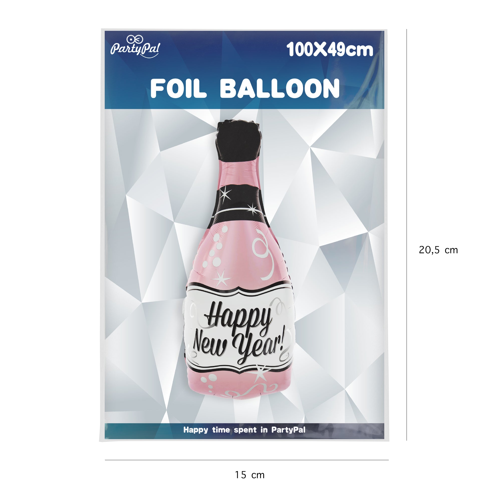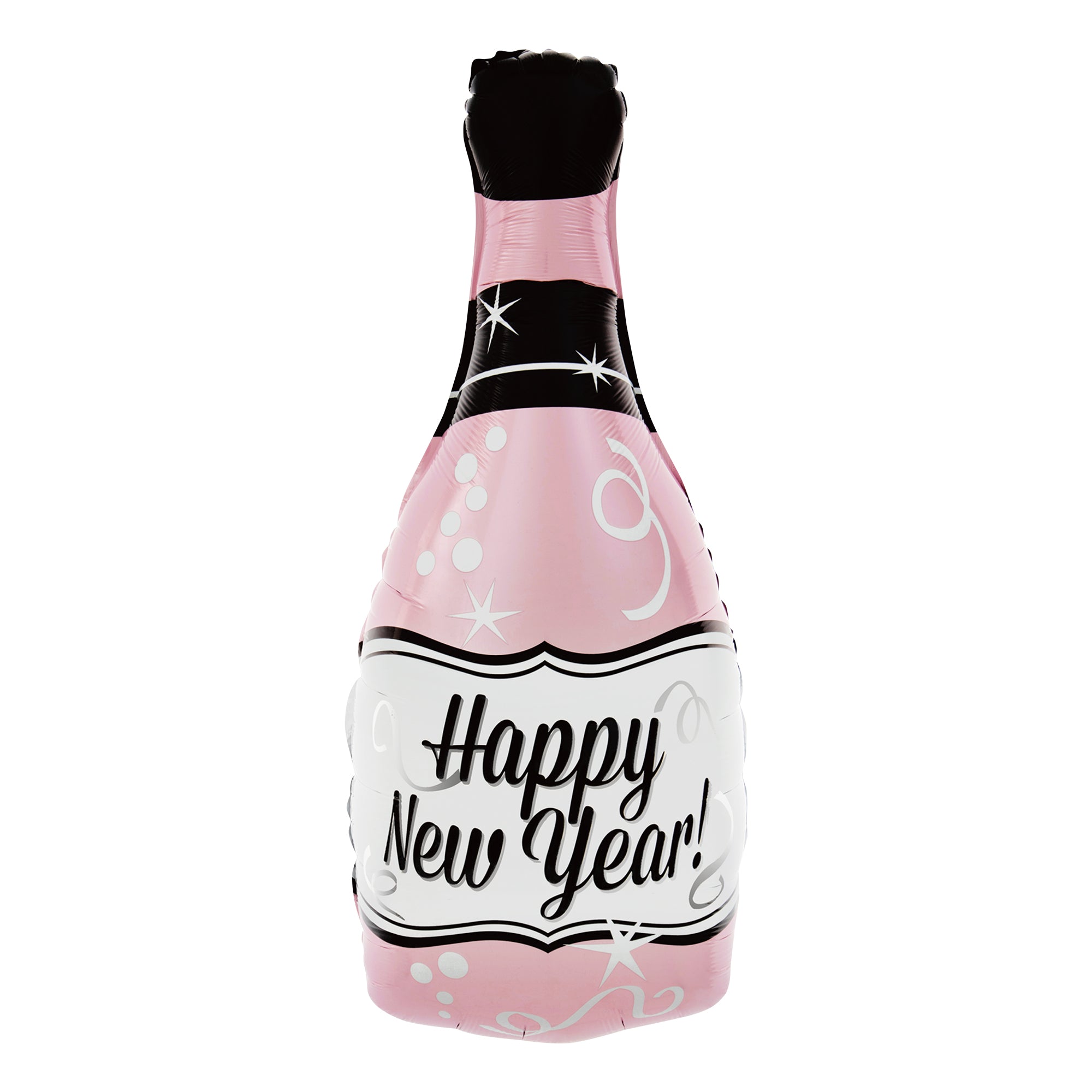 Balon foliowy w kszt.ałcie butelki spodoba się wielbicielom różowego szampana. Na białej etykiecie balonu-butelki, znajduje się czarny napis Happy New Year.
