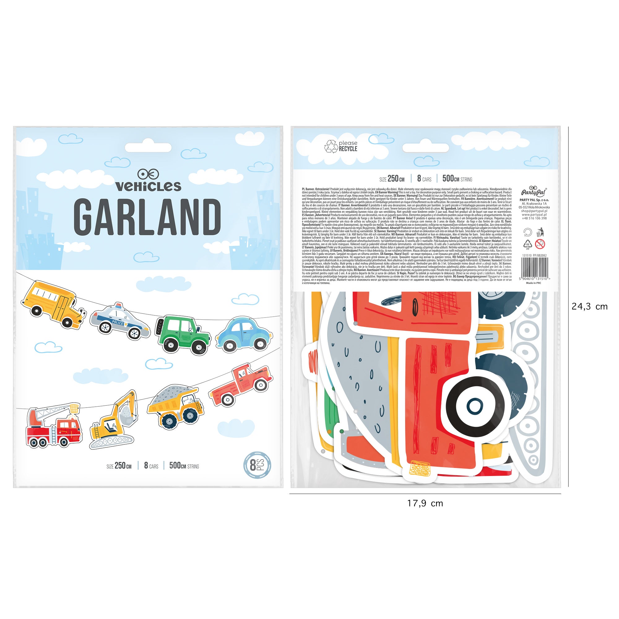 Girlandę tworzy 7 różnych kolorowych aut: żółty autobus szkolny, szaro-niebieski radiowóz, zielony jeep, niebieski garbus, czerwony wóz strażacki, żółta wywrotka oraz czerwony pickup. W komplecie znajduje się również żółta koparka. Wspaniała dekoracja przyjęcia dla fanów motoryzacji.