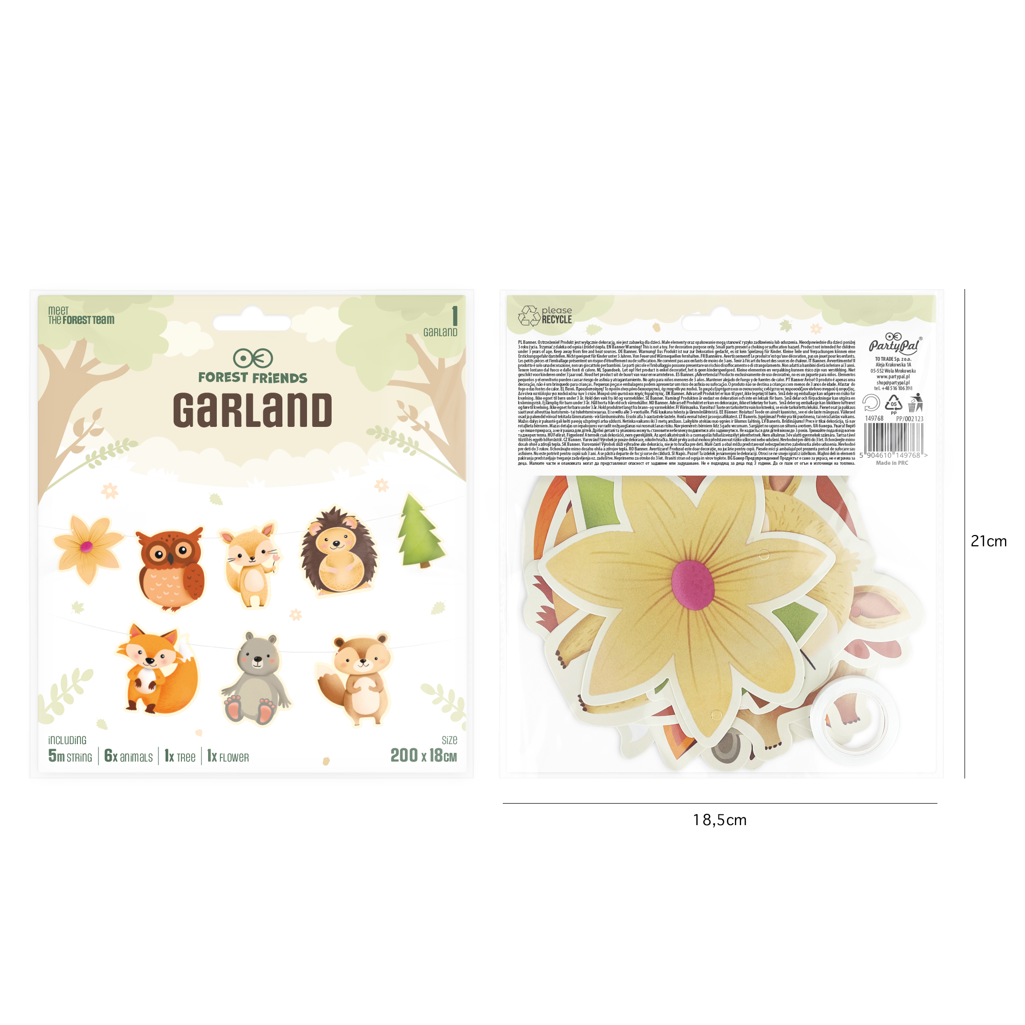 Girlanda ozdobna składa się z 8 elementów: 6 różnych zwierzątek leśnych, drzewa i kwiatu. Sympatyczni leśni przyjaciele chętnie pojawią się na dziecięcych przyjęciach lub ocieplą atmosferę dziecięcego pokoju. Chętnie przyjmą zaproszenie do sal przedszkolnych i sal zabaw.