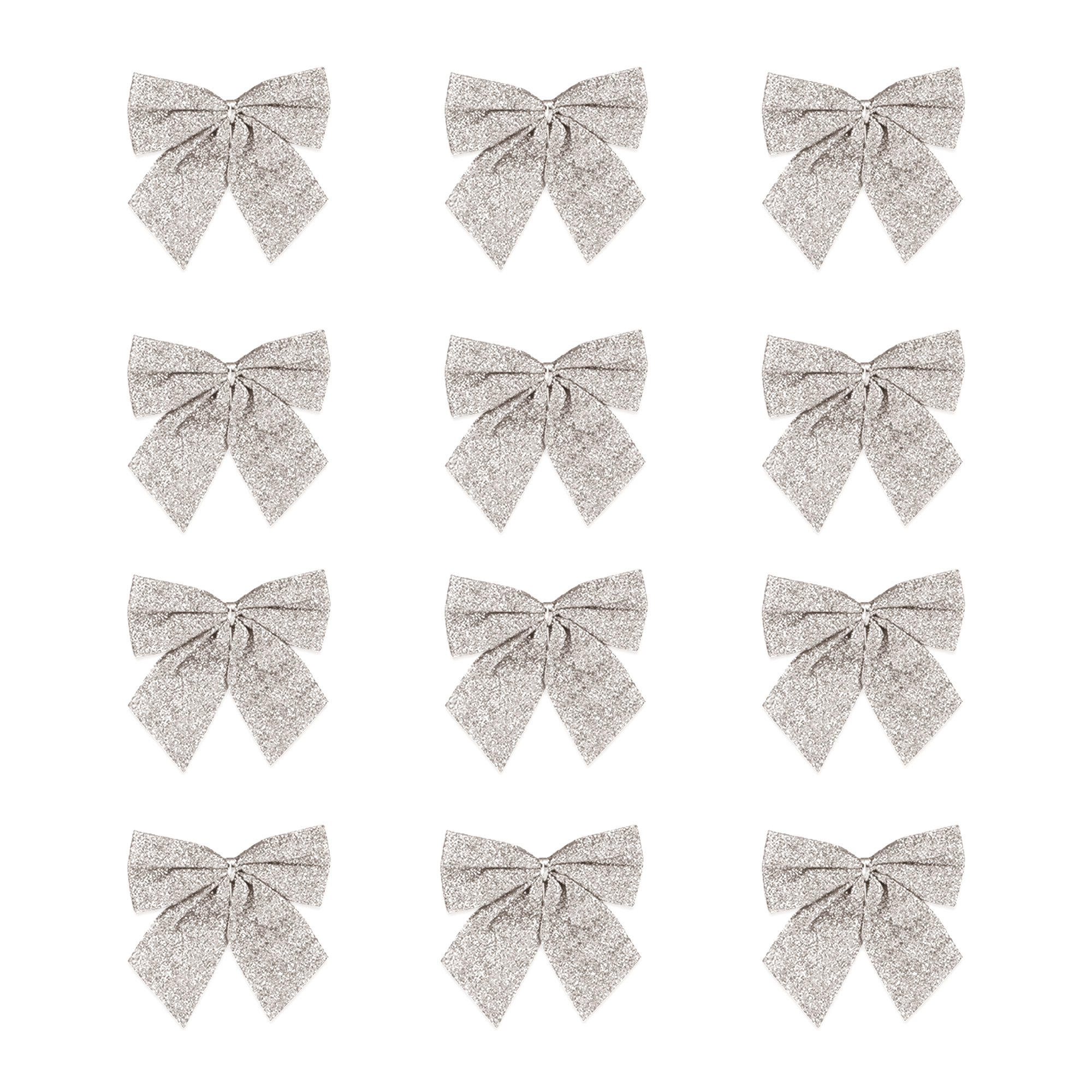 Zestaw 12 szt.uk srebrnych, brokatowych kokardek, które znajdą zastosowanie nie tylko w okresie świątecznym. Można używać ich do ozdabiania prezentów, różnego rodzaju stroików, przy uroczystej aranżacji stołu ale także jako ozdoby choinkowe.