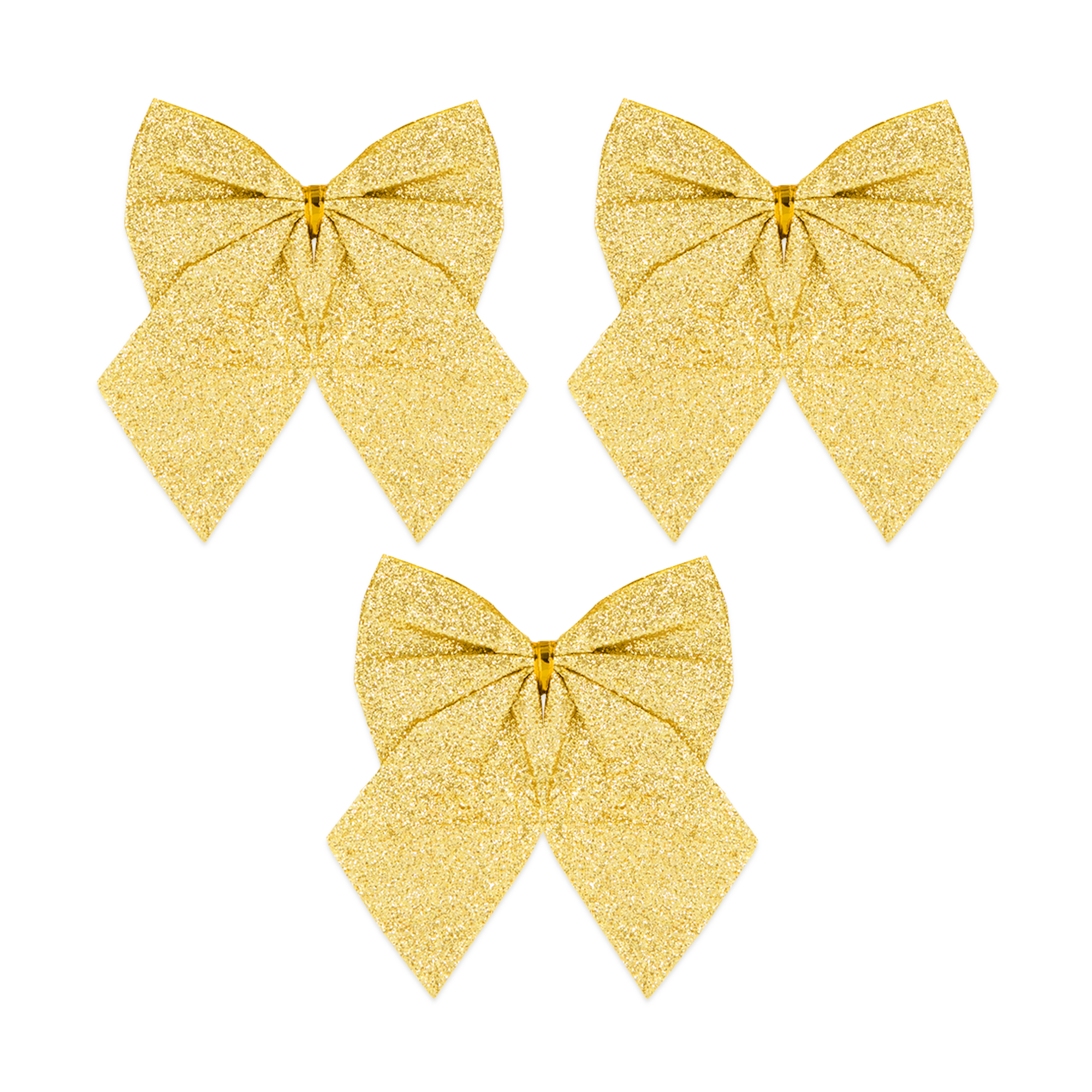 Zestaw 3 szt.uk złotych, brokatowych kokardek, które znajdą zastosowanie nie tylko w okresie świątecznym. Można używać ich do ozdabiania prezentów, różnego rodzaju stroików, przy uroczystej aranżacji stołu, ale także jako ozdoby choinkowe.