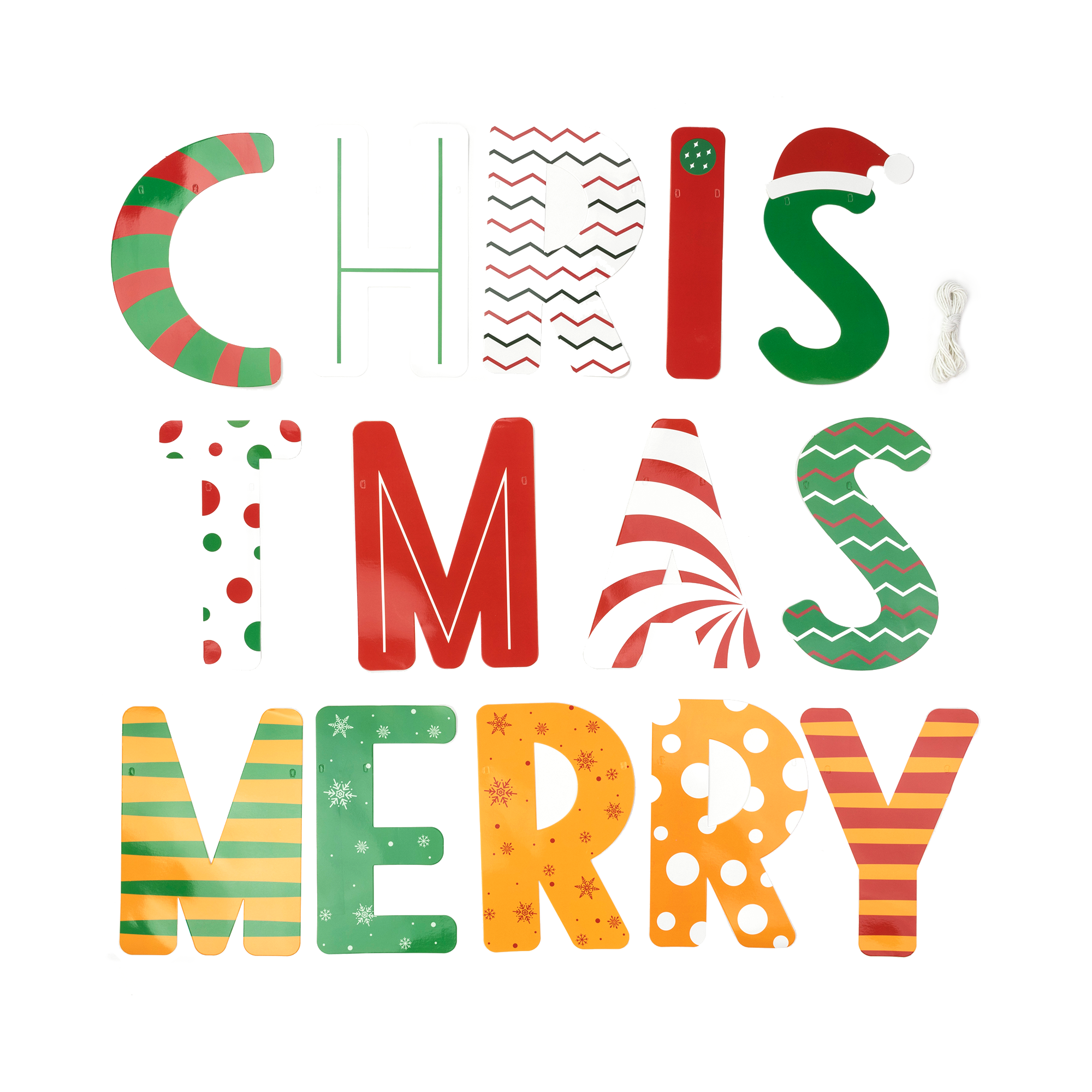 Baner z literami tworzącymi napis Merry Christmas. Każda z liter ma inny kolor i grafikę, dzięki czemu przykuwa uwagę i zachęca do dokładnego jego obejrzenia. baner będzie wspaniałą dekoracją na świątecznych spotkaniach.