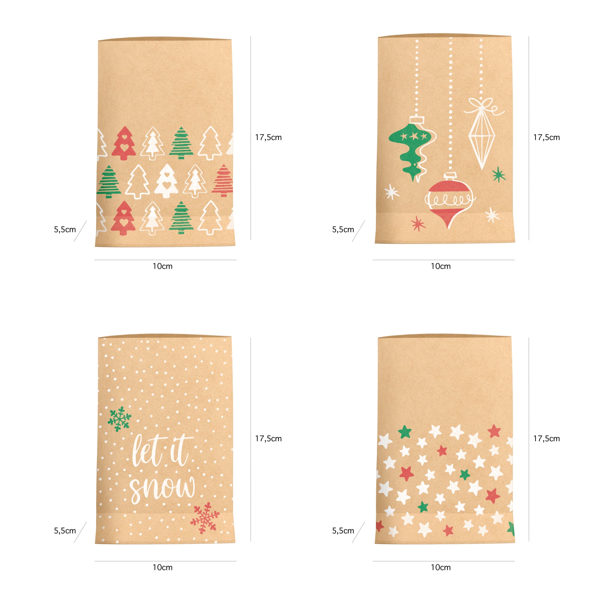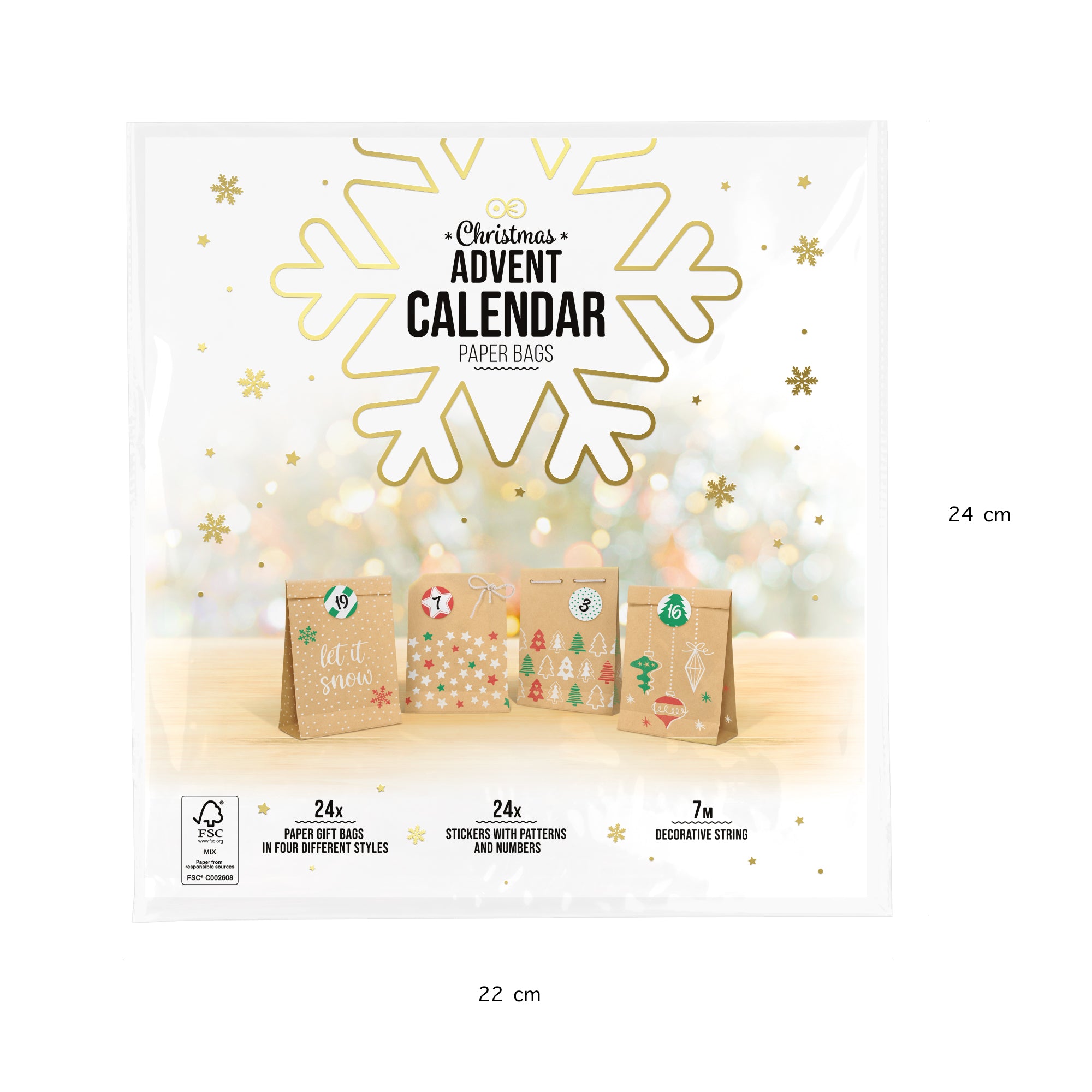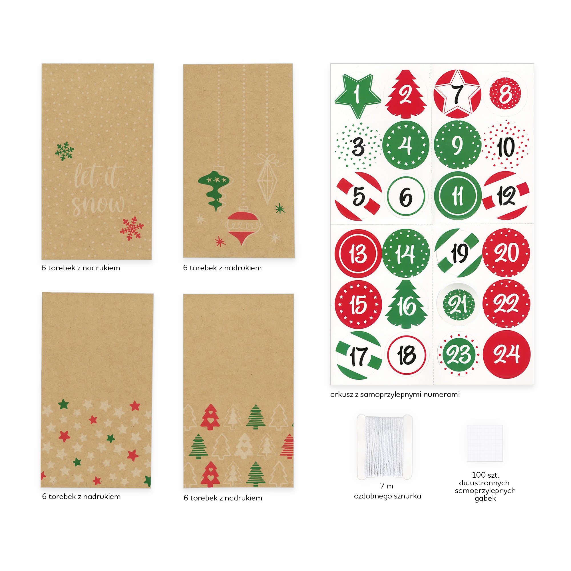 • Zestaw zawiera 24 torebki papierowe ze świątecznym nadrukiem (4 rodzaje po 6 torebek), arkusz naklejek z kolorowymi numerkami, 7 m ozdobnego sznurka, 100 szt. dwustronnych samoprzylepnych gąbek