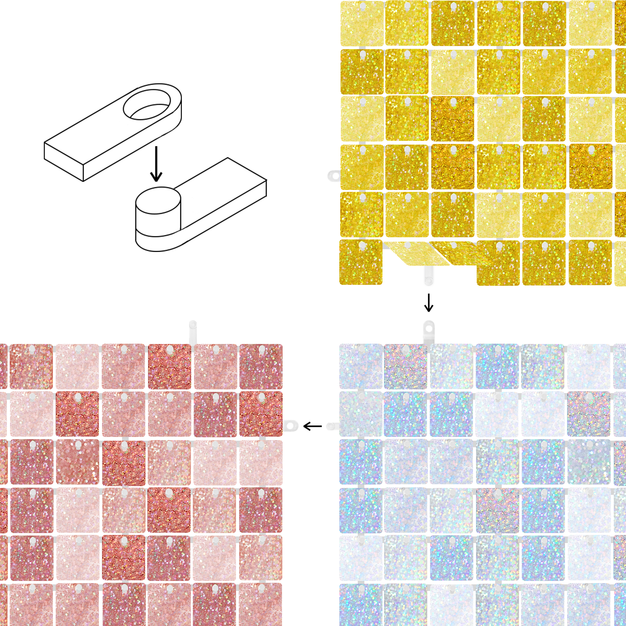 Seria paneli dekoracyjnych, dzięki którym można stworzyć atrakcyjne tło do sesji zdjęciowej lub na wystrzałową imprezę. Każdy panel składa się ze 100 pojedynczych, luźno zawieszonych blaszek, które dają niezwykle ciekawy, trójwymiarowy efekt poruszając się na skutek ruchu powietrza. Cekinowa struktura i połysk sprawiają, że efektownie odbijają światło. Idealne na wesele, urodziny, Sylwester czy zabawę karnawałową.