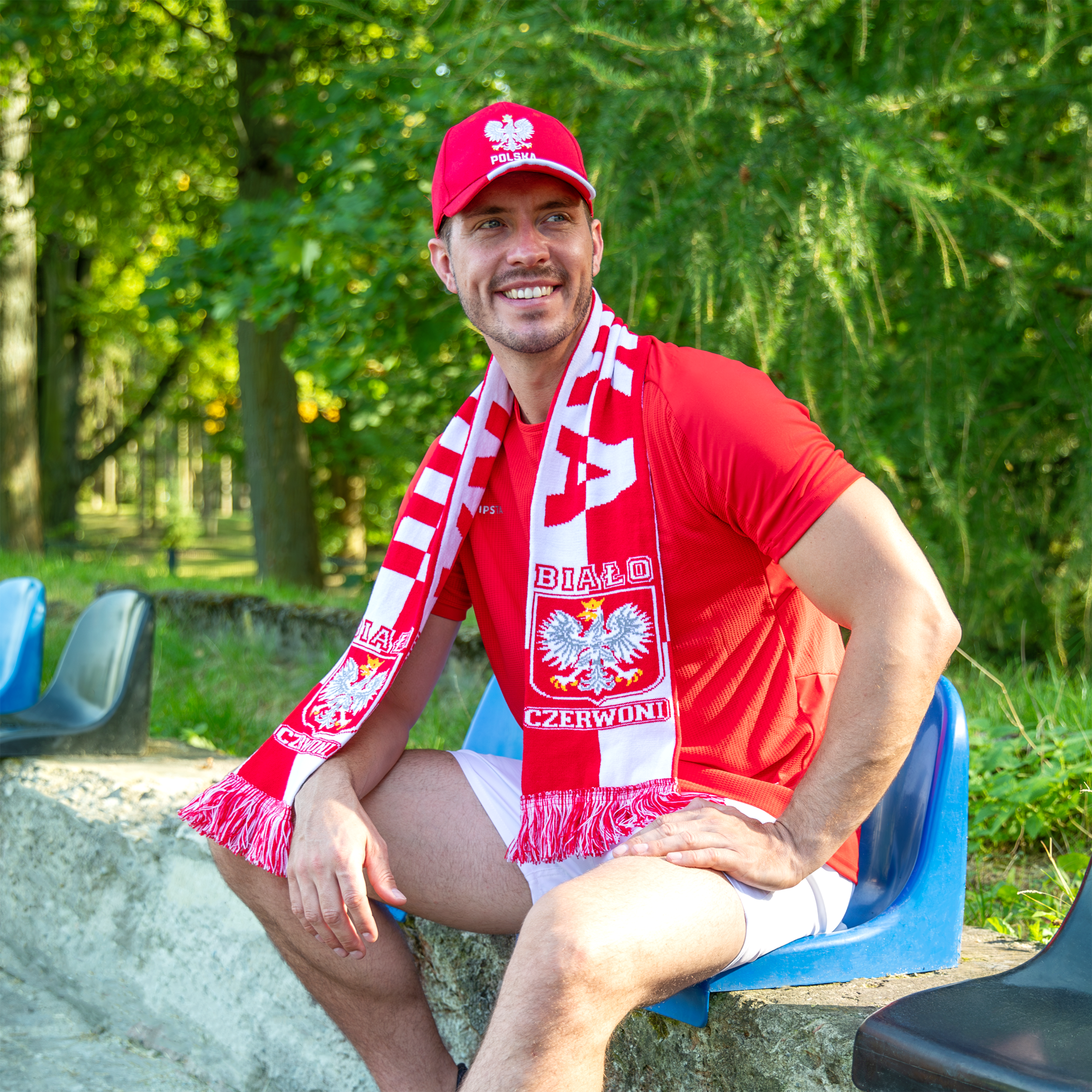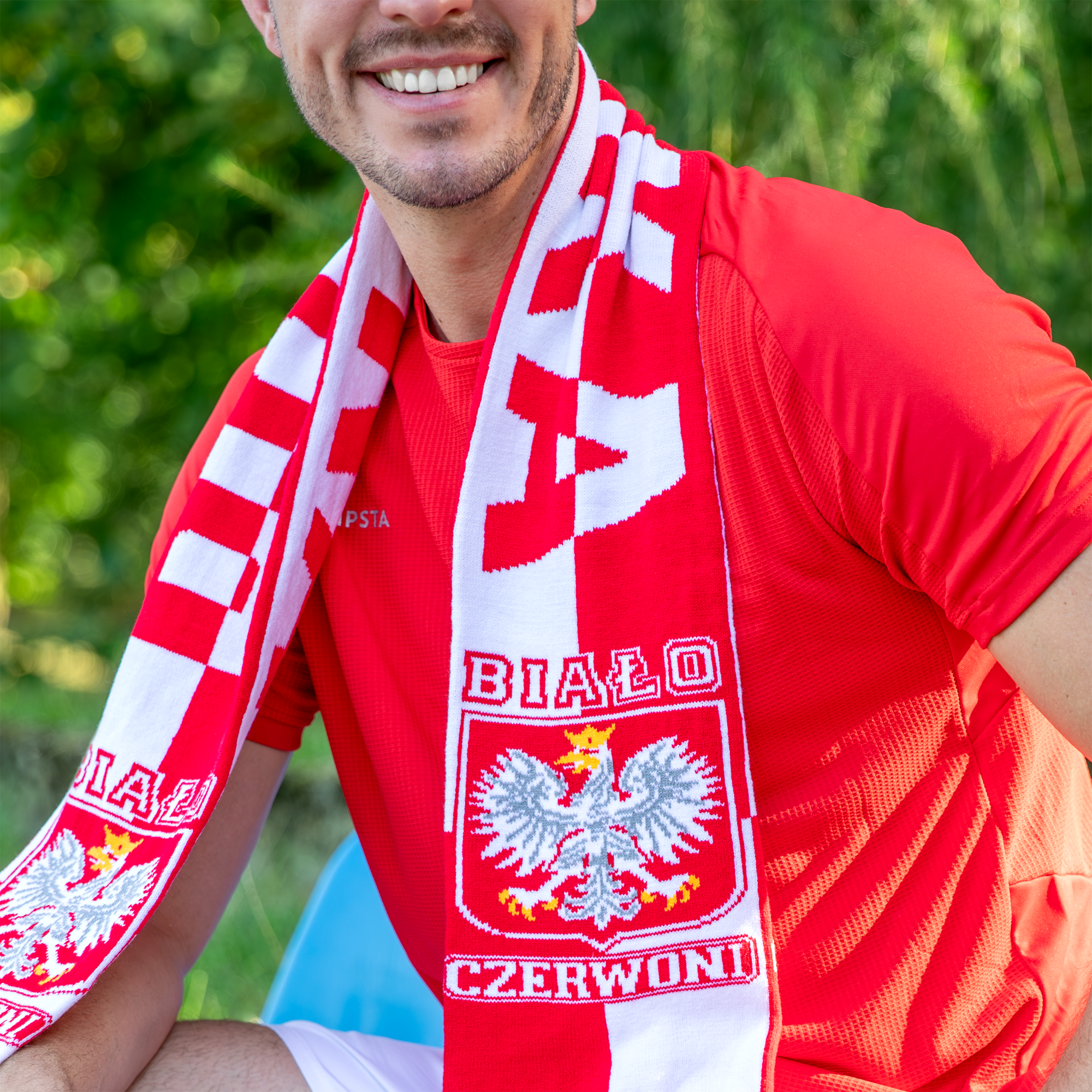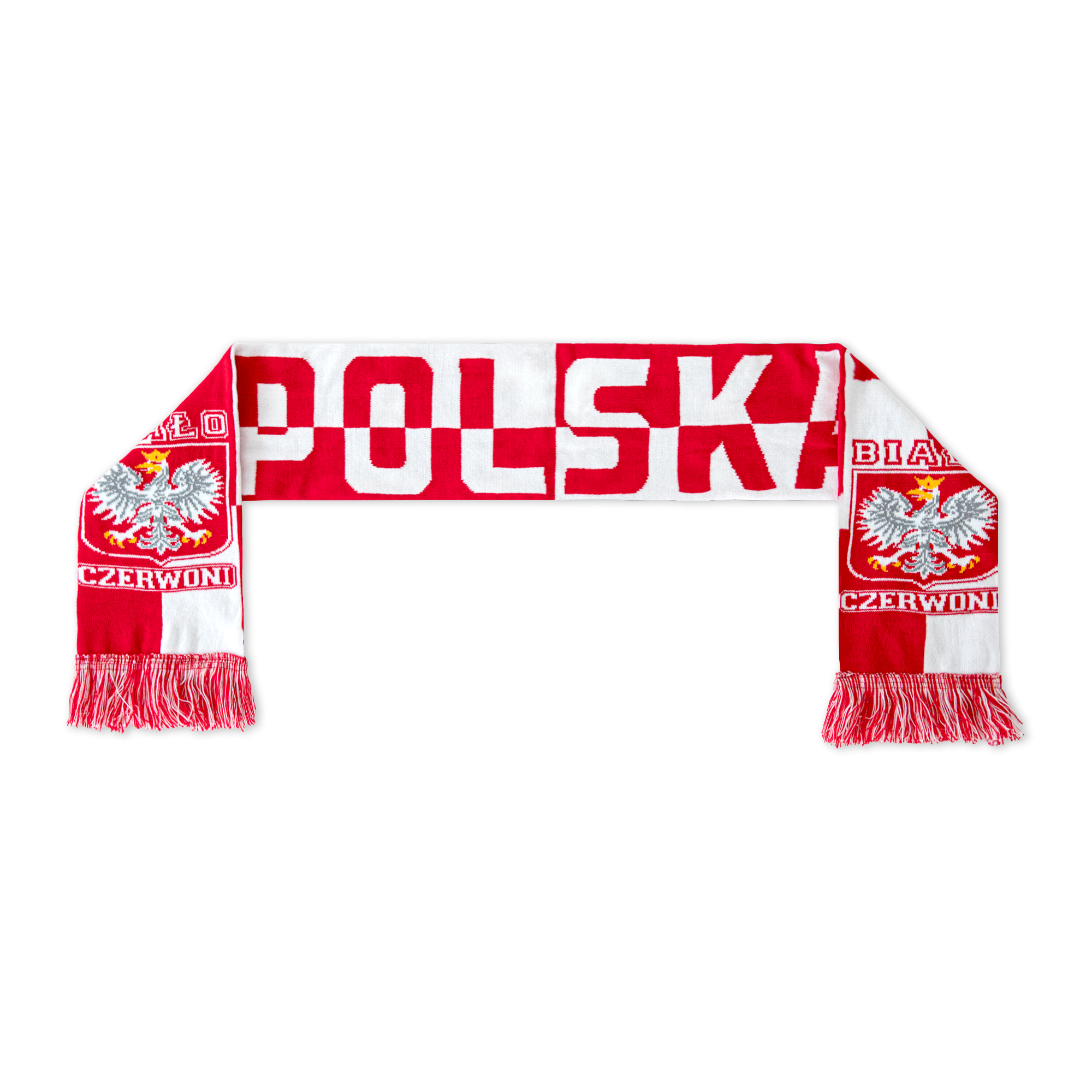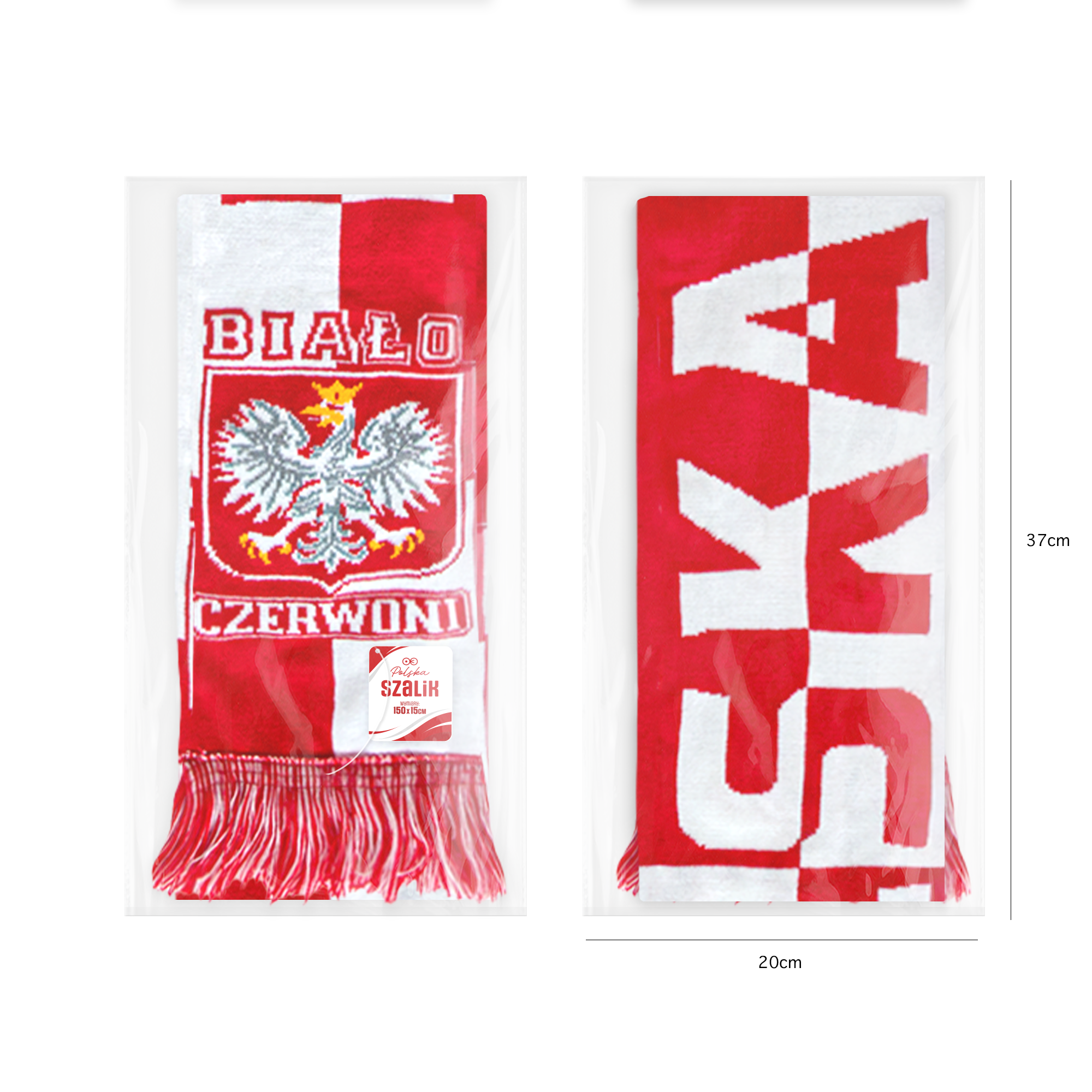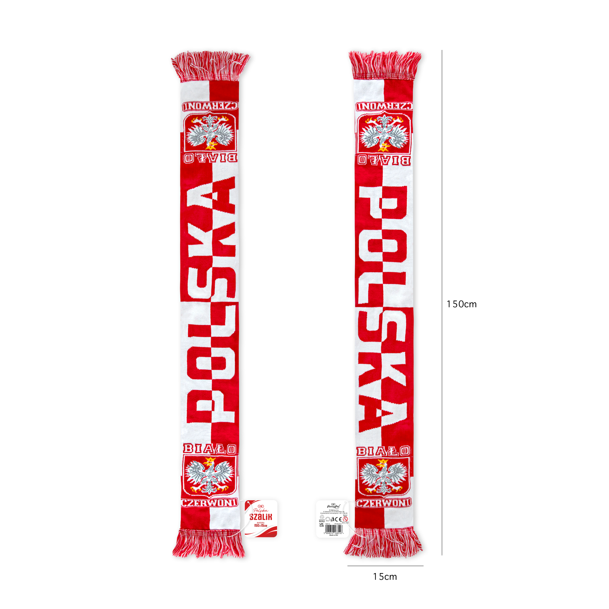 Szalik z dzianiny dwustronny z dużym napisem POLSKA zakończony frędzlami. Bardzo wytrzymały, delikatny i miły w dotyku. Niezastąpiony atrybut każdego kibica!