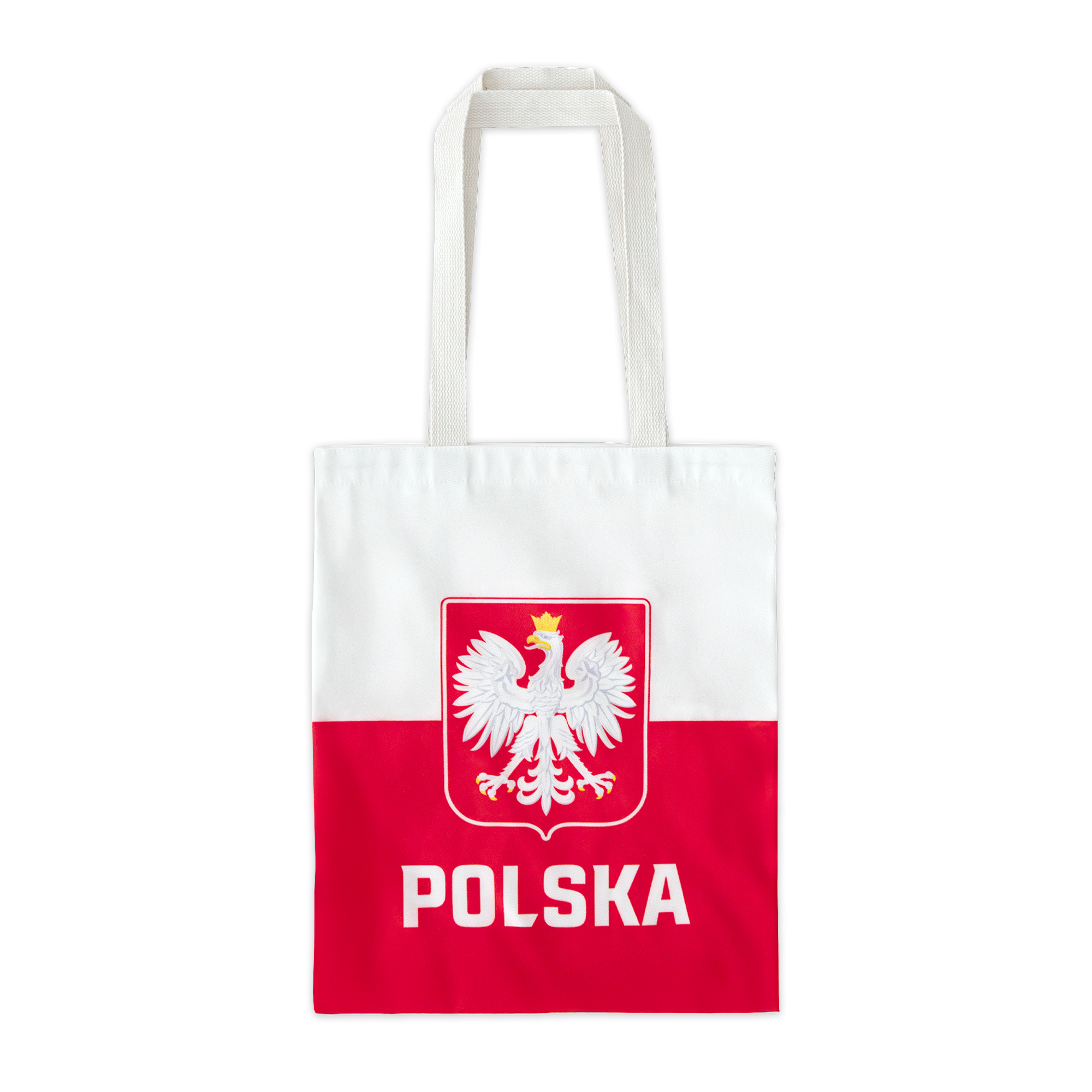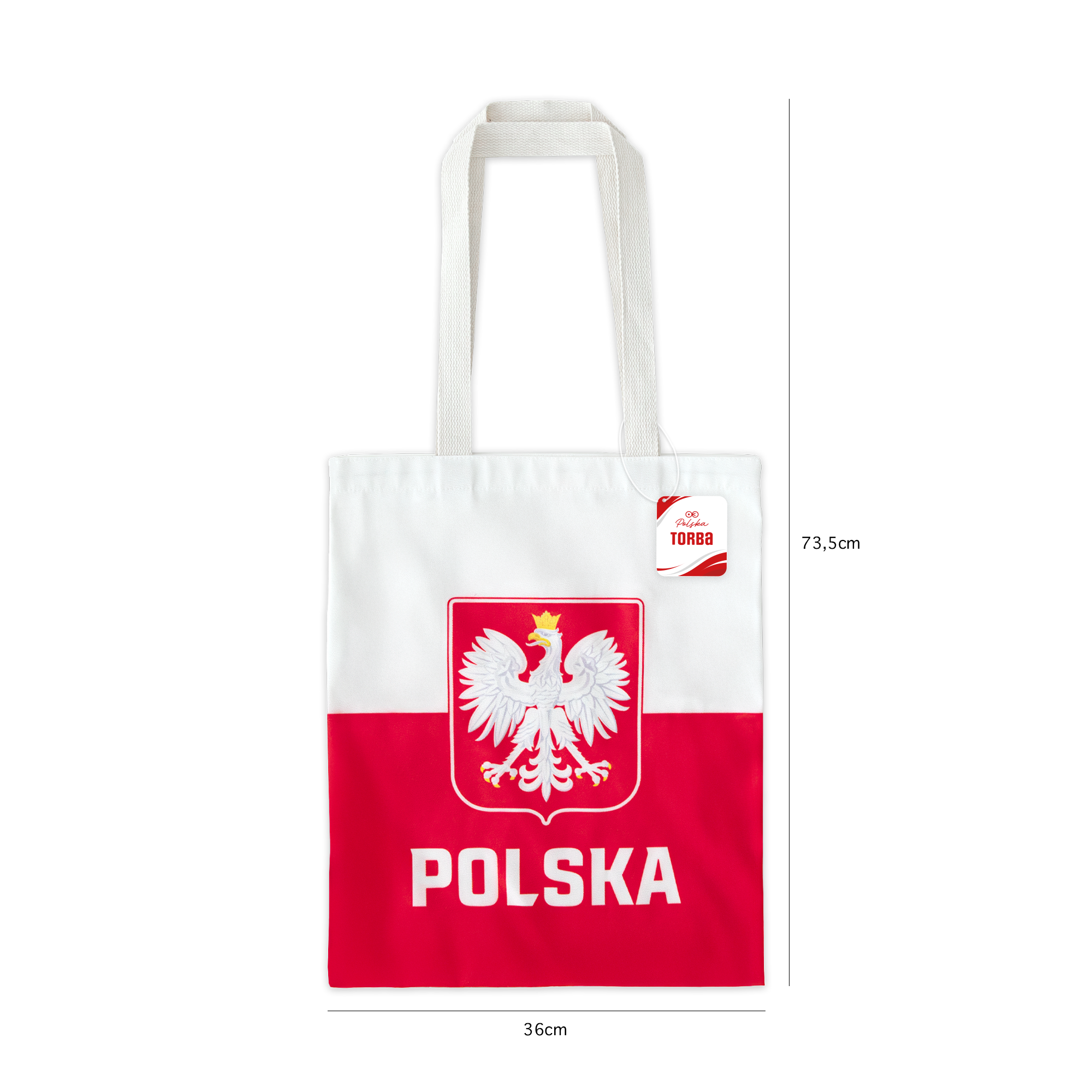 Torba biało-czerwona z nadrukiem Orła oraz napisem POLSKA - idealnie sprawdzi się w podroży jak również w codziennych aktywnościach w mieście, pracy czy na spacerze. Torba posiada 2 uchwyty.