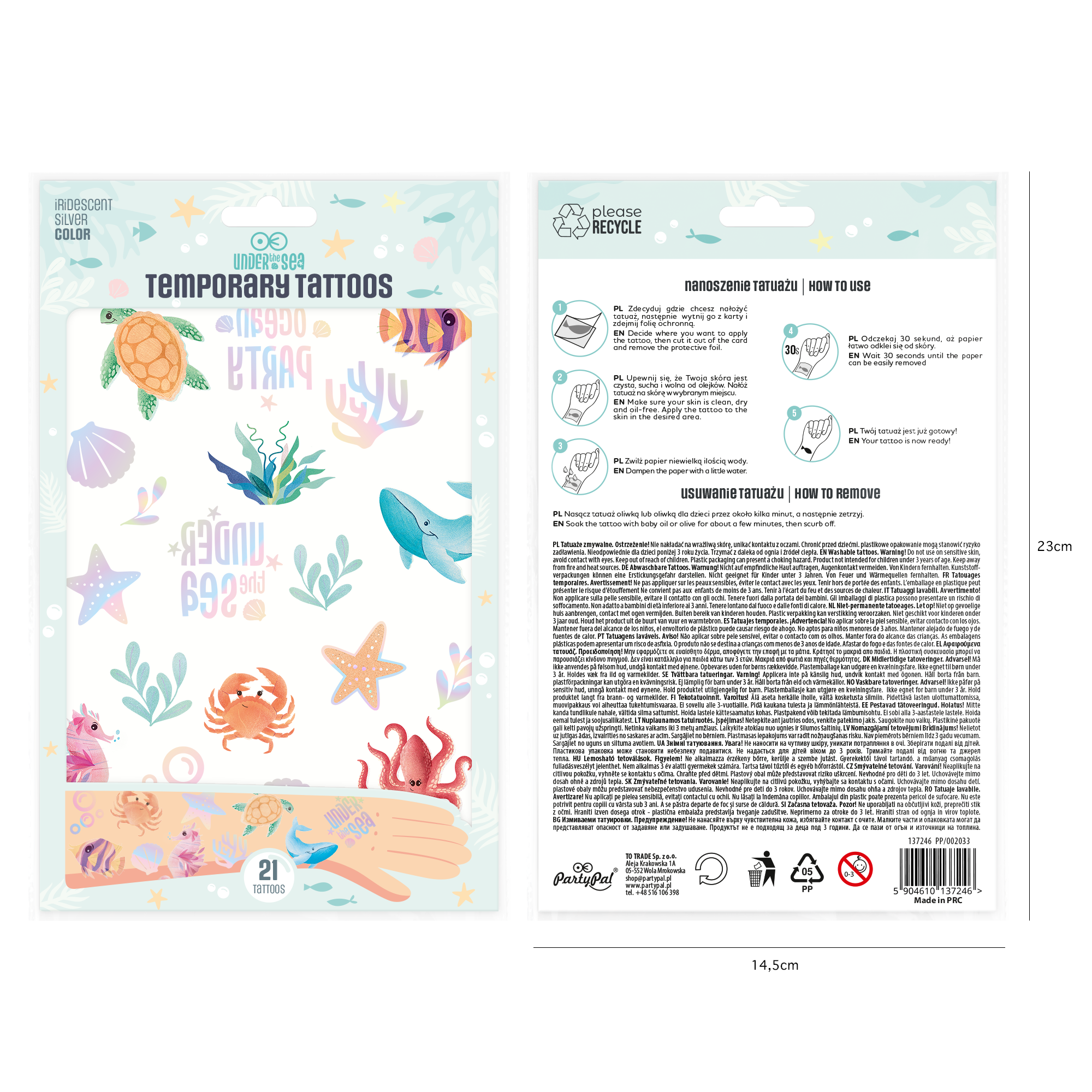 Tatuaże zmywalne z postaciami z podwodnego świata będą przebojem na dziecięcym przyjęciu. Mali imprezowicze mają do wyboru 21 różnych tatuaży z sympatycznymi, kolorowymi lub pięknie opalizującymi zwierzątkami i algami morskimi.