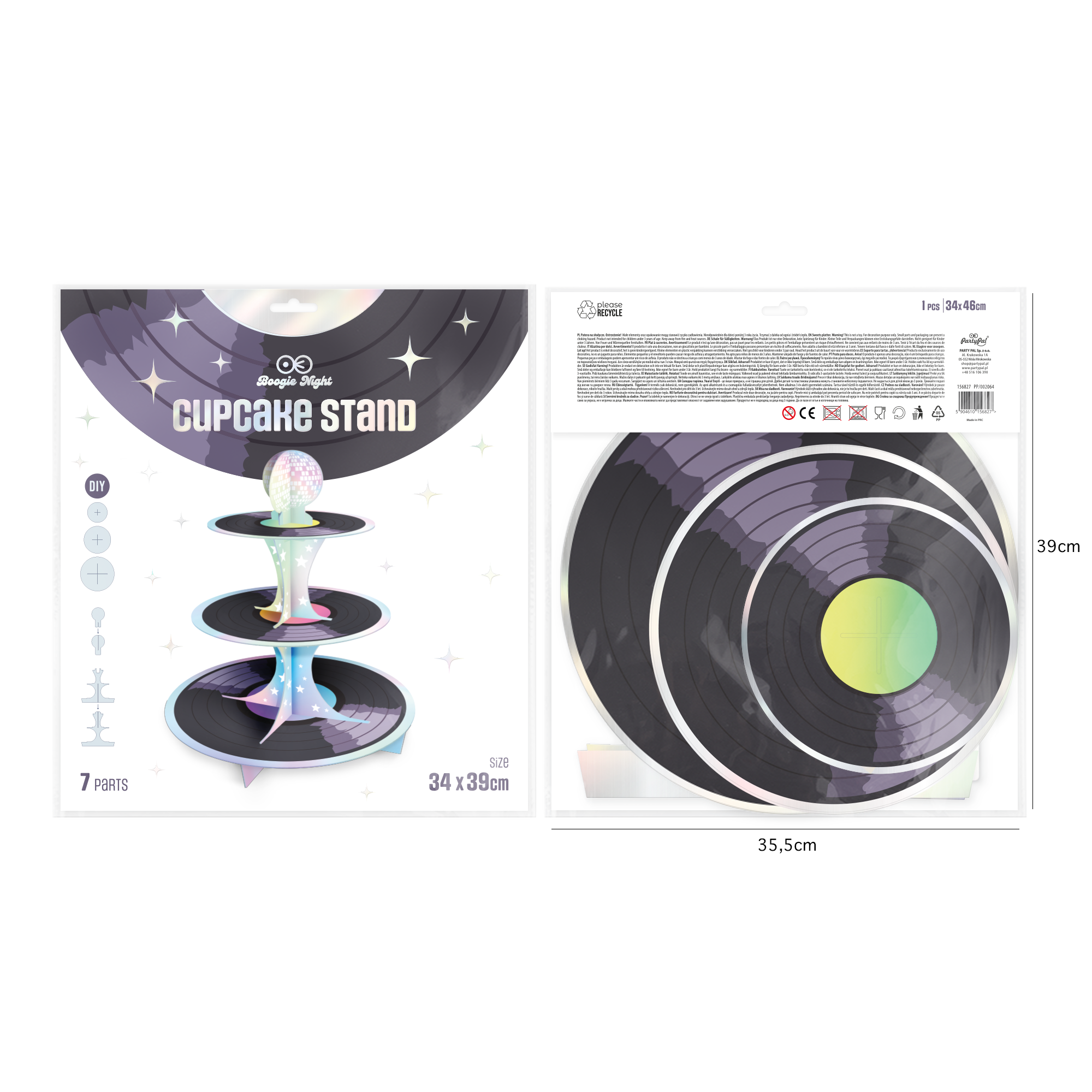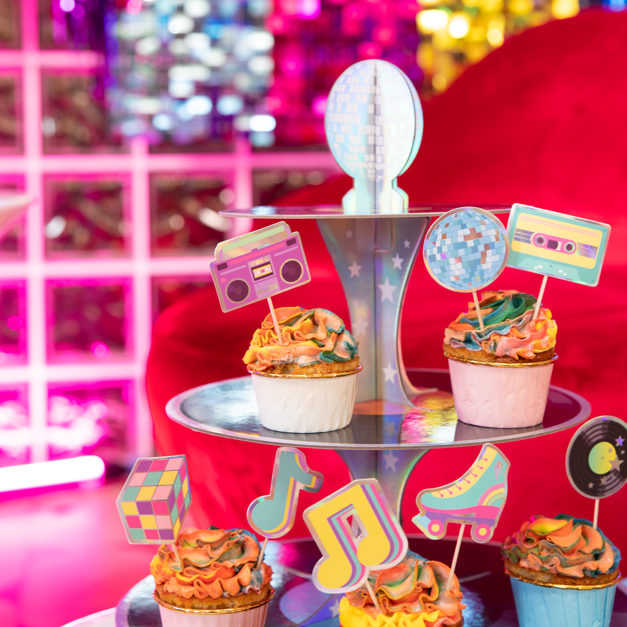 Patera na ciasta składająca się z trzech poziomów. Stworzona w stylu retro disco, każdy poziom to płyta winylowa w innym kolorze, góra zwieńczona kulą disco, całość wykonana z op. zbiorczeu.