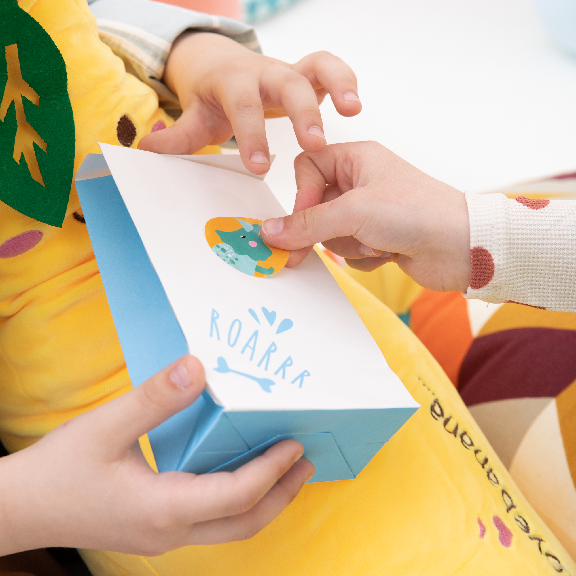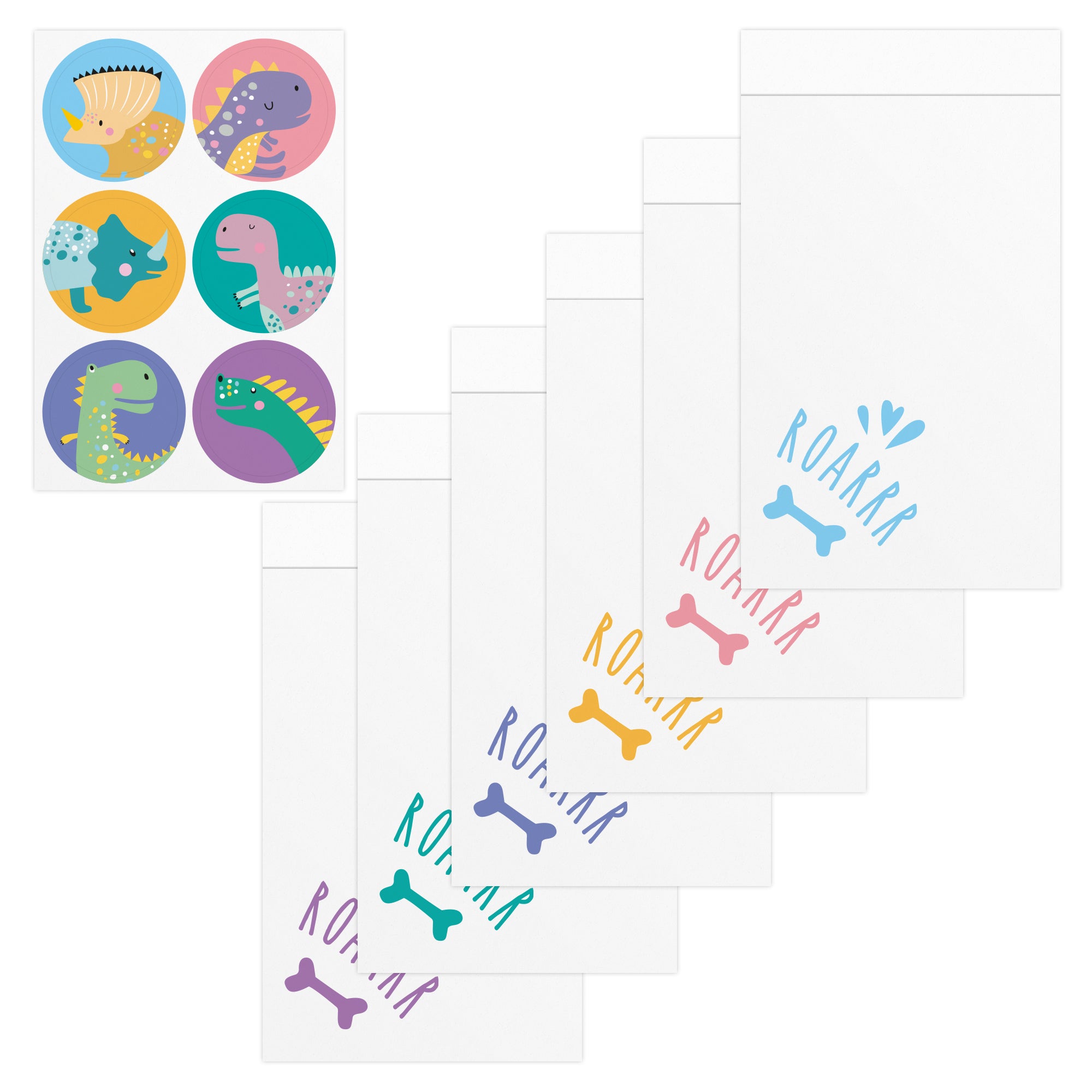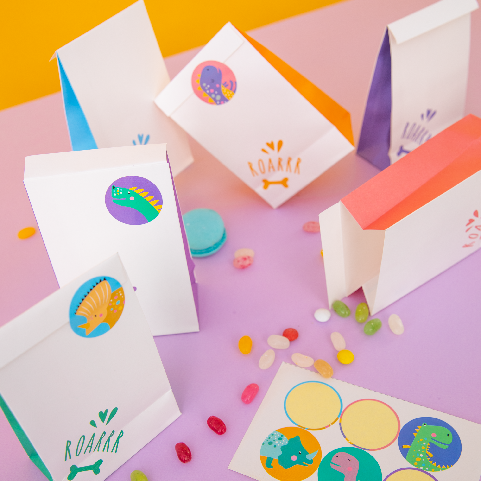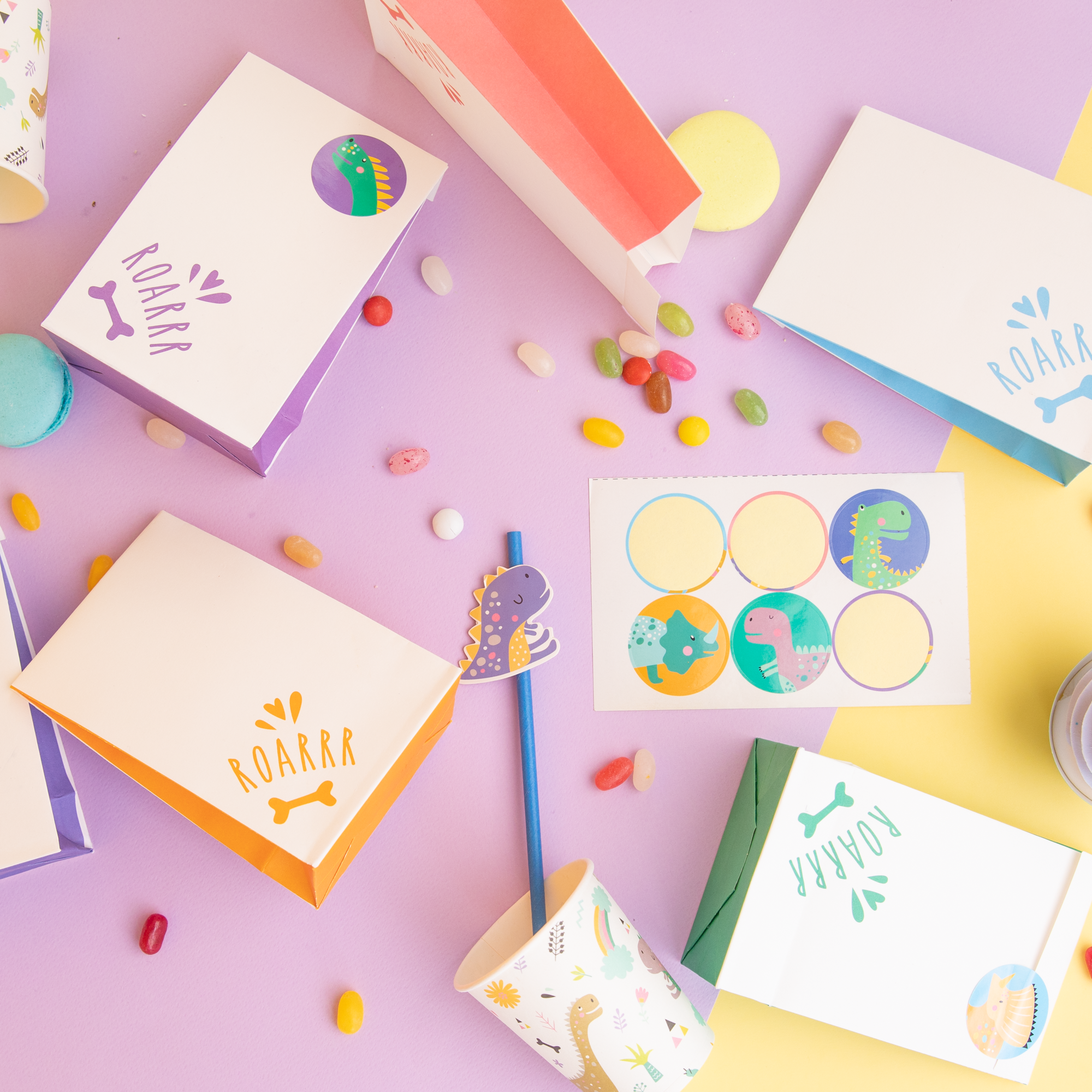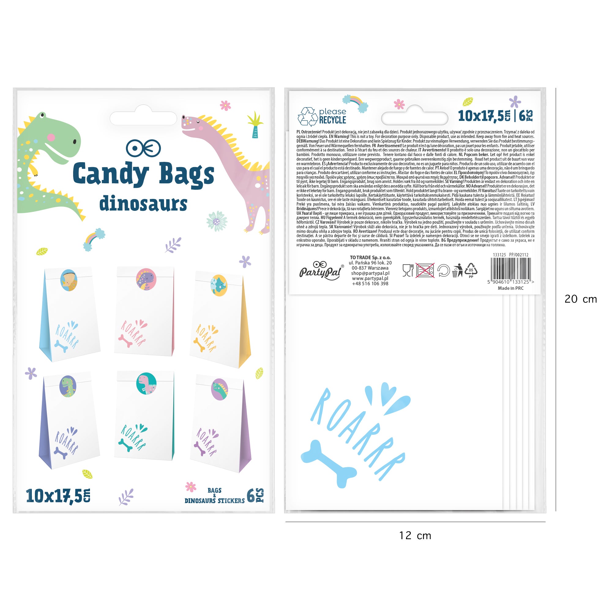 Torebki na słodycze to wspaniały sposób na obdarowanie zaproszonych na imprezę małych gości. Każda z papierowych torebek posiada boki w innym kolorze. Do zestawu dołączone są naklejki z 6 różnymi sympatycznymi dinozaurami.