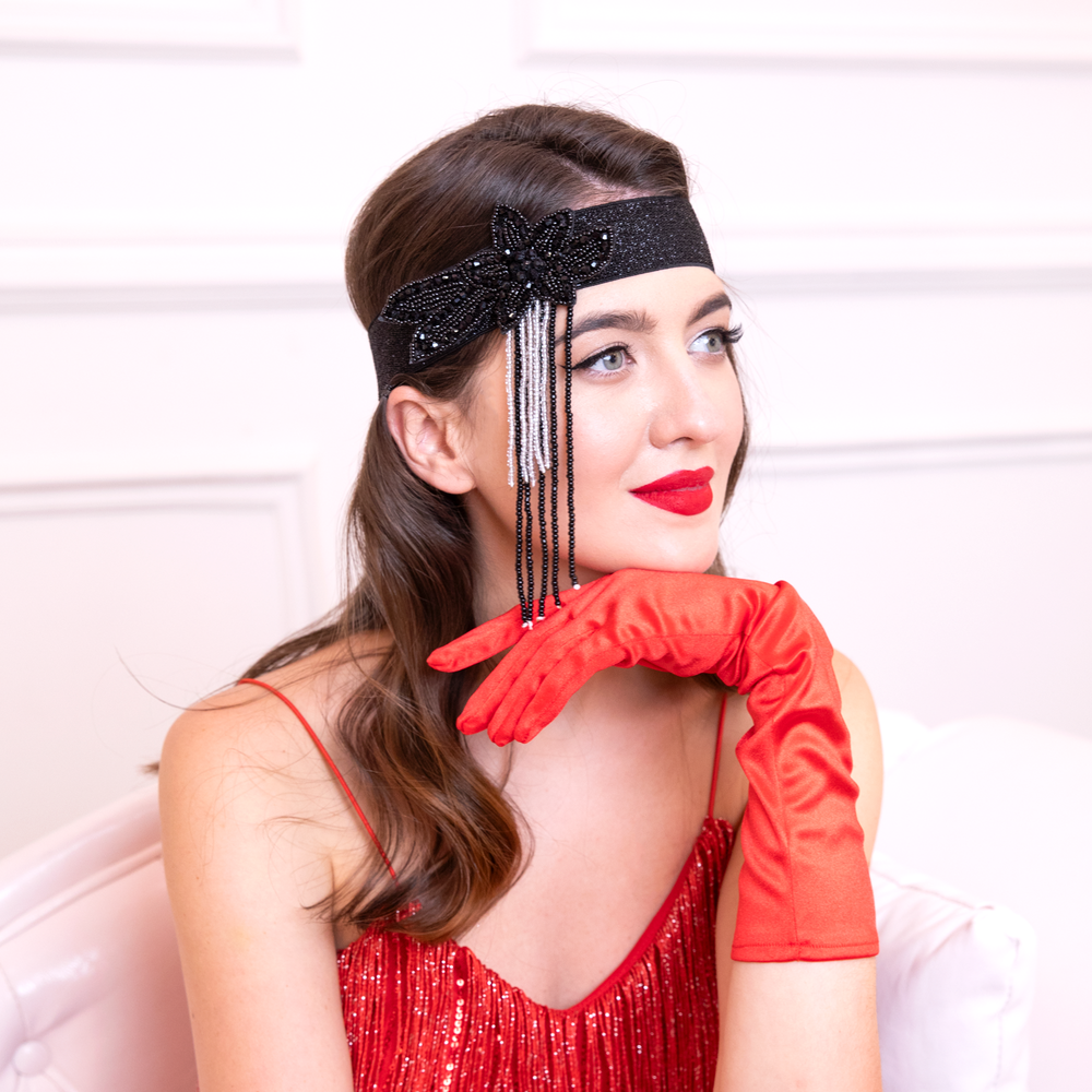 Ozdoba w kszt.ałcie czarnego kwiatu z frędzelkami z koralików w kolorach czarnym i srebrnym.