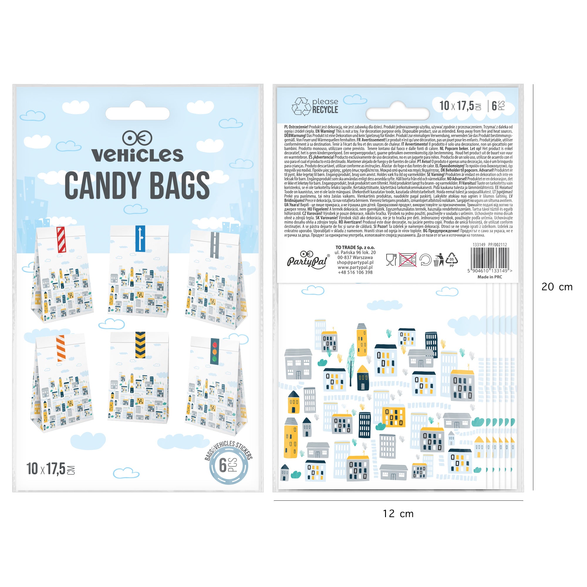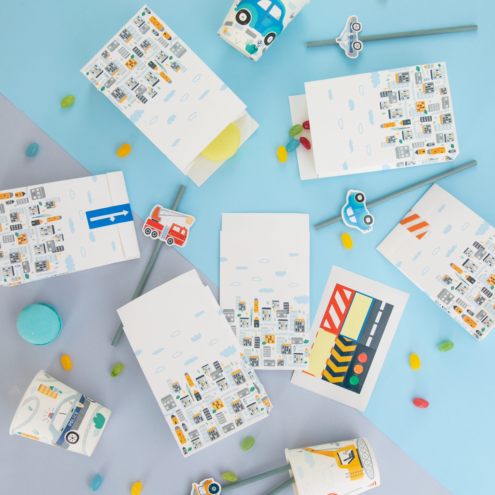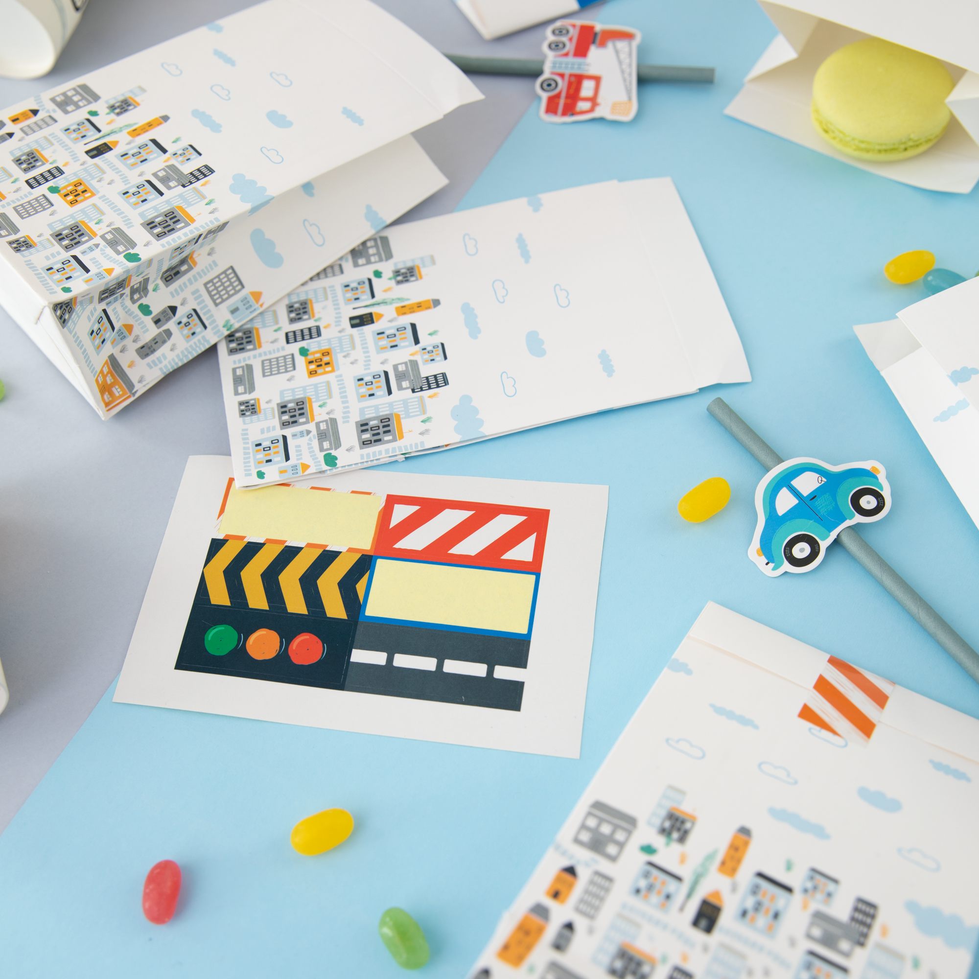 Teraz łatwo podziękujesz małym gościom za przybycie na imprezę. Pomogą w tym papierowe torebki na słodycze z grafiką przedstawiającą miasto. Wyobraźnia podpowie dziecku jakim samochodem będzie jeździć po jego ulicach. Do zestawu dołączone są naklejki o różnych wzorach i kolorach.