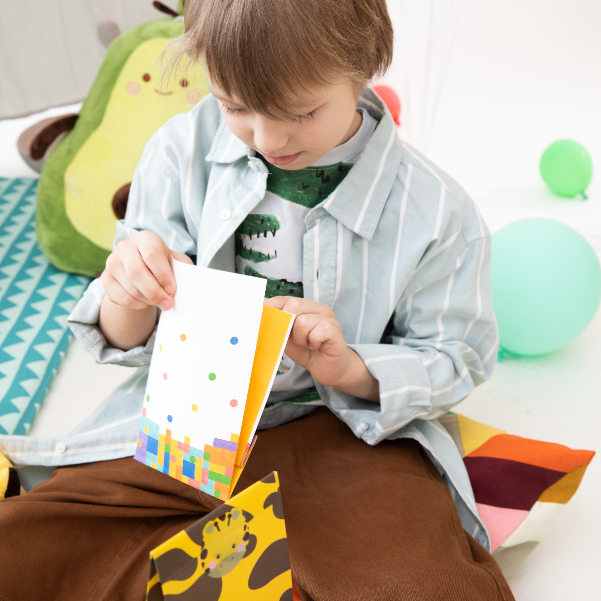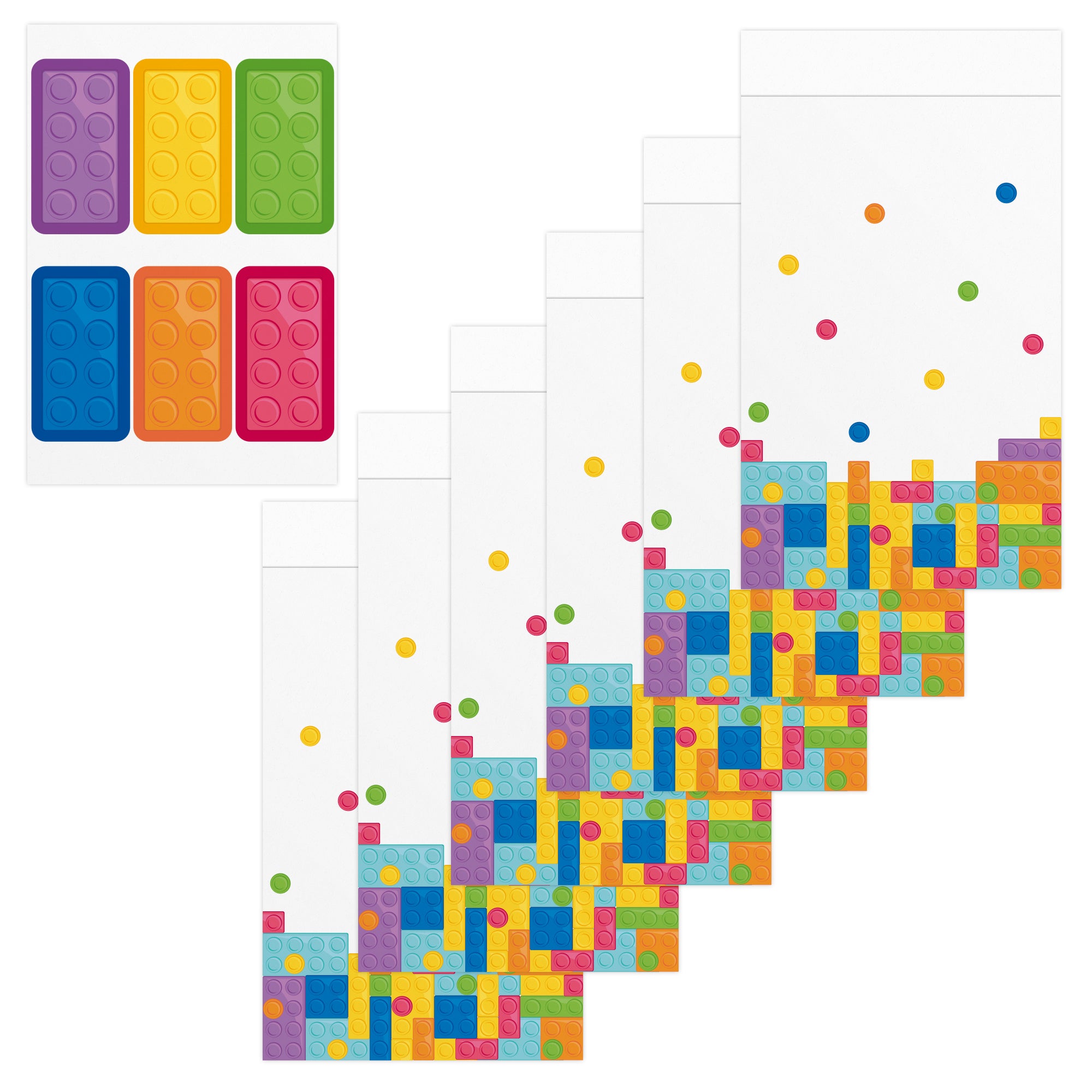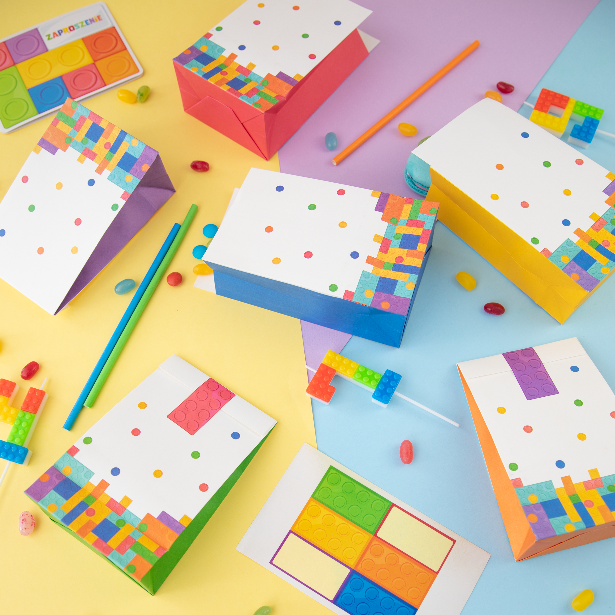 Torebki na słodycze dla uczestników przyjęcia z klockami w roli głównej. Wesołe, jak cała kolekcja, torebki różnią się kolorami boków i naklejek. Czy znajdą się w nich również różne cukierki?