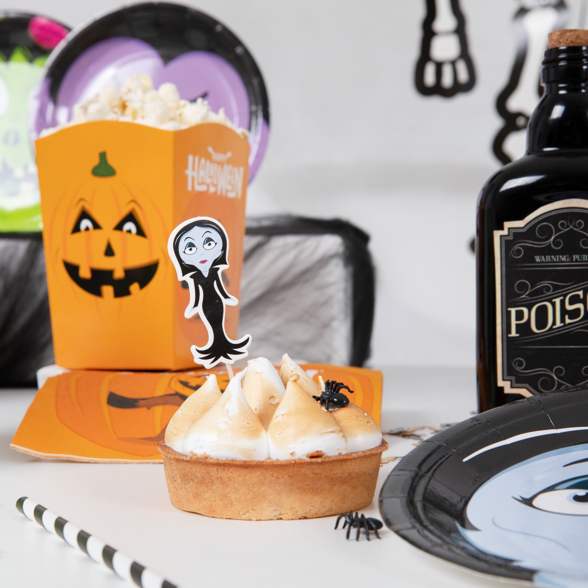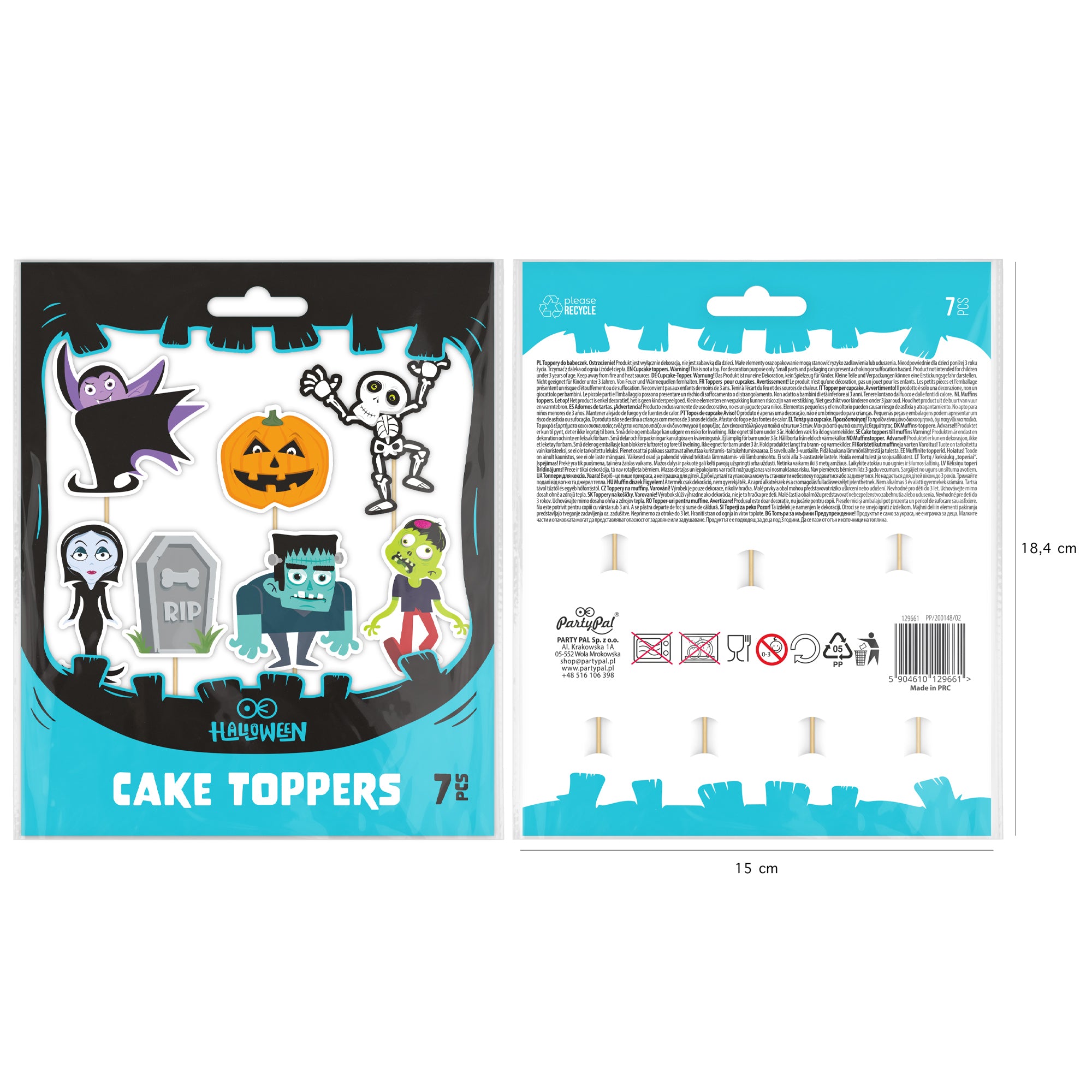 W zestawie znajduje się 7 szt.uk topperów na tort lub do babeczek. Podobizny wampira, dyni, kościotrupa, wampirzycy, nagrobku, Frankensteina i zombie zachęcą dzieci do próbowania słodkich przekąsek.